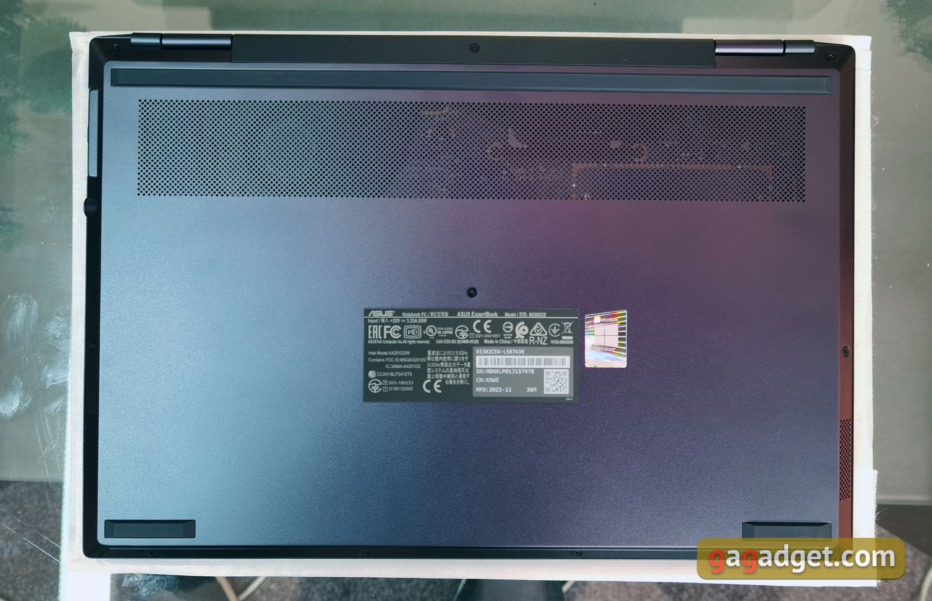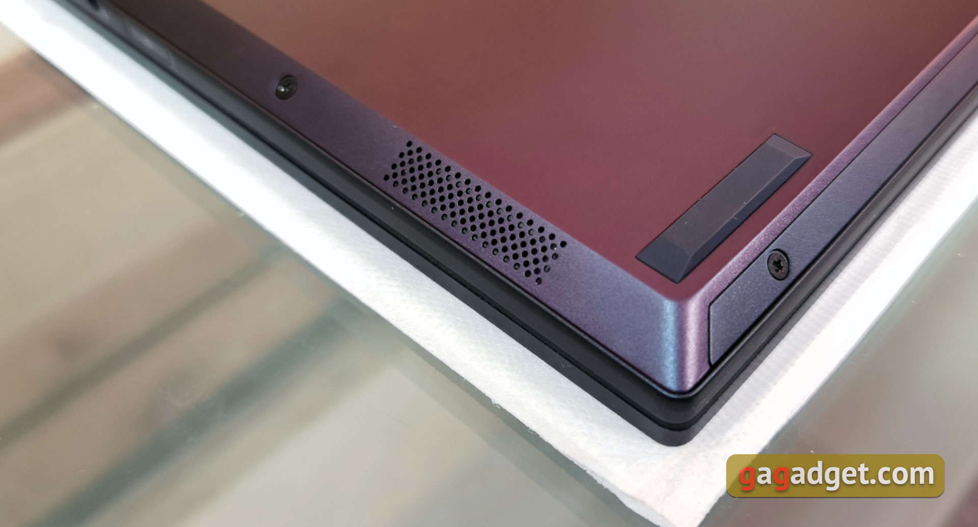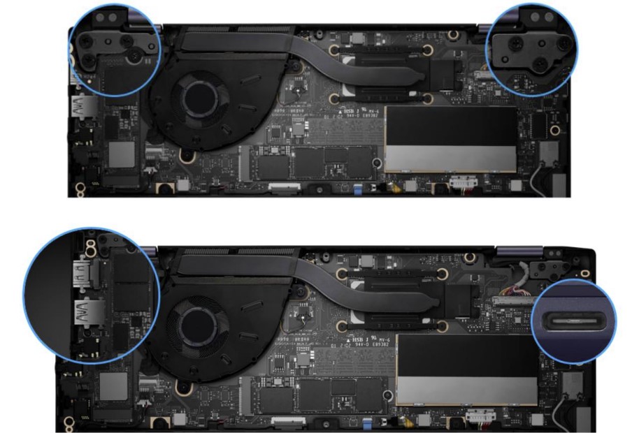 Spód laptopa posiada wiele otworów wentylacyjnych. Z tyłu znajduje się jedna gumowa wstawka prawie na całą szerokość laptopa, z przodu są jeszcze dwie gumowe nóżki zapewniające bezpieczne położenie na stole. Bliżej przodu laptopa znajdują się głośniki stereo po bokach. Dolna pokrywa jest przymocowana dziesięcioma śrubkami ze standardowym gniazdem Phillips, więc jej zdjęcie nie będzie bardzo trudne. Dzięki temu będzie można wymienić lub dodać drugi dysk SSD M.2. Mogą one pracować w trybach RAID0/1. Jest też jeden wolny slot na pamięć RAM. Całkiem niezły, jak na tak kompaktowy model.