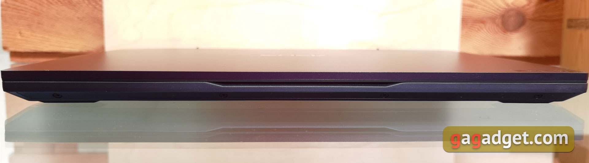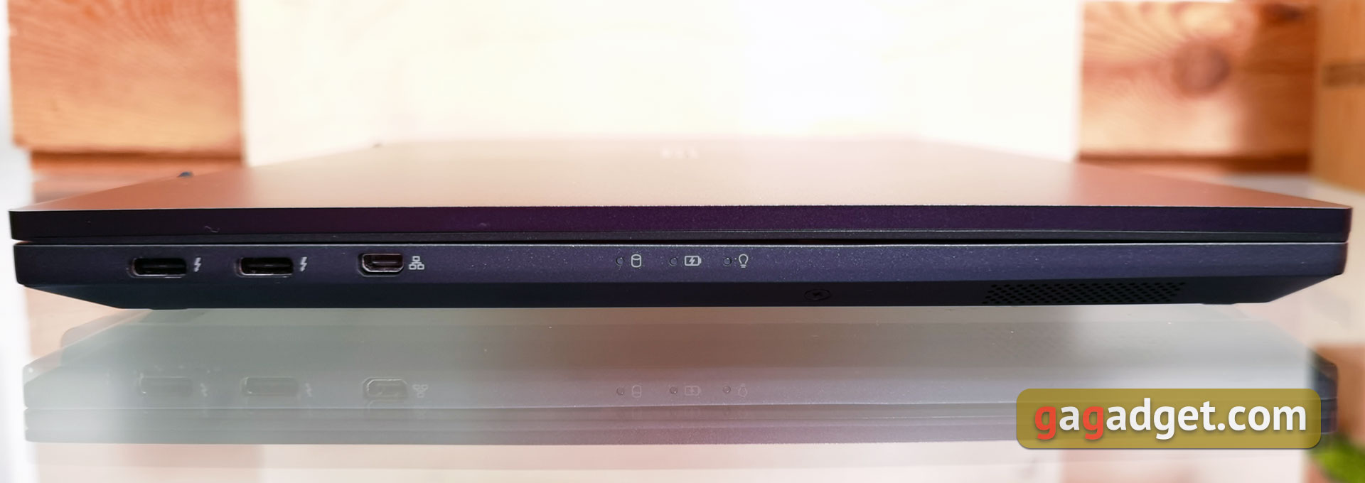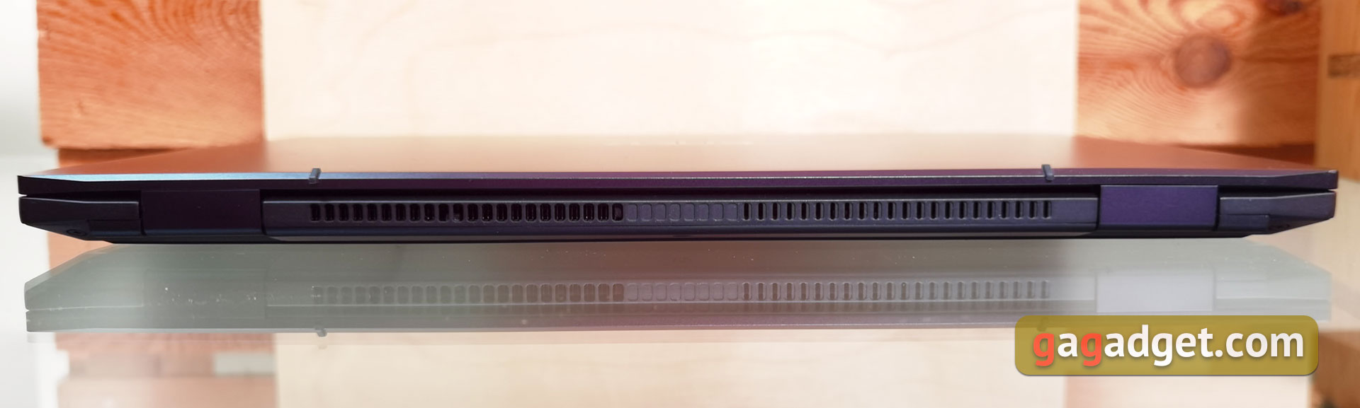 Spód laptopa posiada wiele otworów wentylacyjnych. Z tyłu znajduje się jedna gumowa wstawka prawie na całą szerokość laptopa, z przodu są jeszcze dwie gumowe nóżki zapewniające bezpieczne położenie na stole. Bliżej przodu laptopa znajdują się głośniki stereo po bokach. Dolna pokrywa jest przymocowana dziesięcioma śrubkami ze standardowym gniazdem Phillips, więc jej zdjęcie nie będzie bardzo trudne. Dzięki temu będzie można wymienić lub dodać drugi dysk SSD M.2. Mogą one pracować w trybach RAID0/1. Jest też jeden wolny slot na pamięć RAM. Całkiem niezły, jak na tak kompaktowy model.