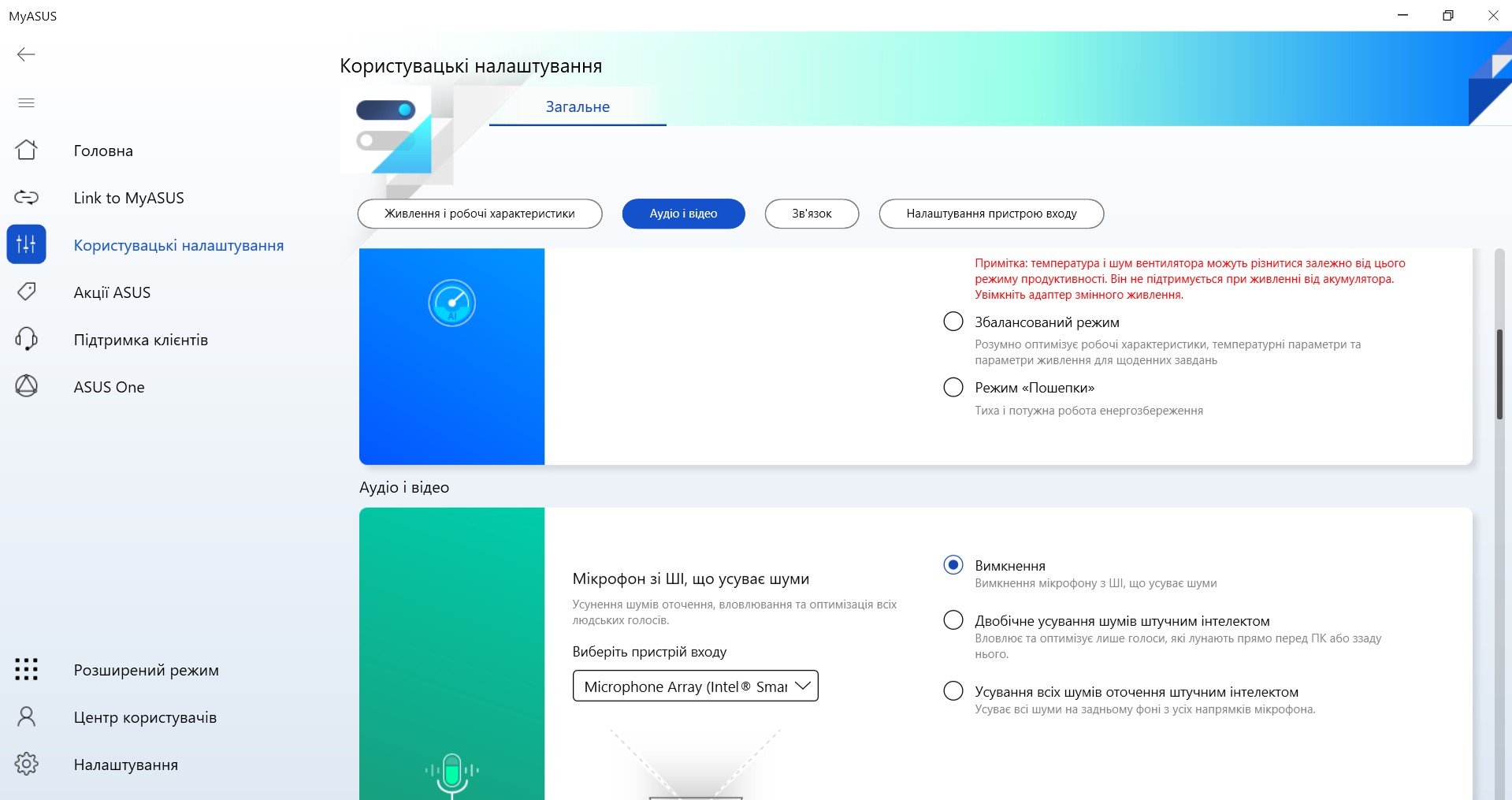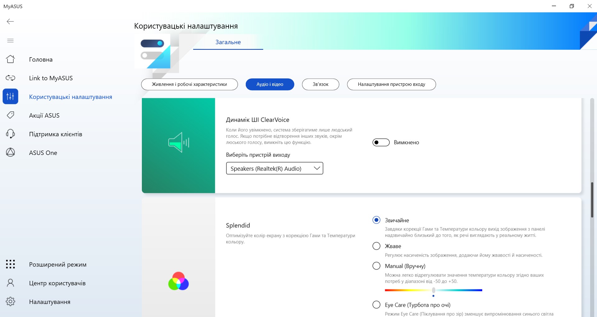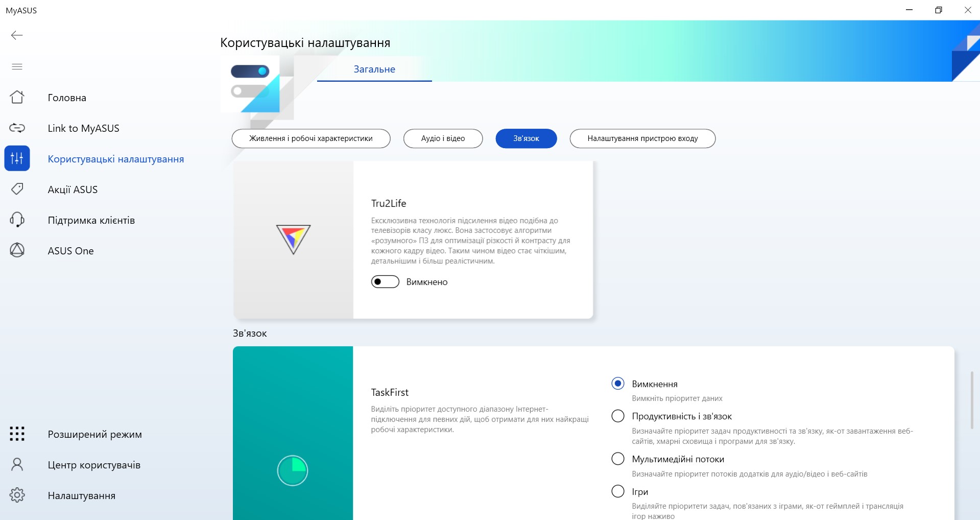 Zestaw autorskiego oprogramowania składa się z kilku aplikacji. Głównym z nich jest MyASUS, który jest stosowany we wszystkich laptopach firmy. Posiada standardową funkcjonalność dla takich zastosowań: monitorowanie systemu, przełączanie trybów wydajności i ładowania, aktualizacja systemu, ustawienie funkcjonalnego rzędu klawiszy, redukcja szumów AI.