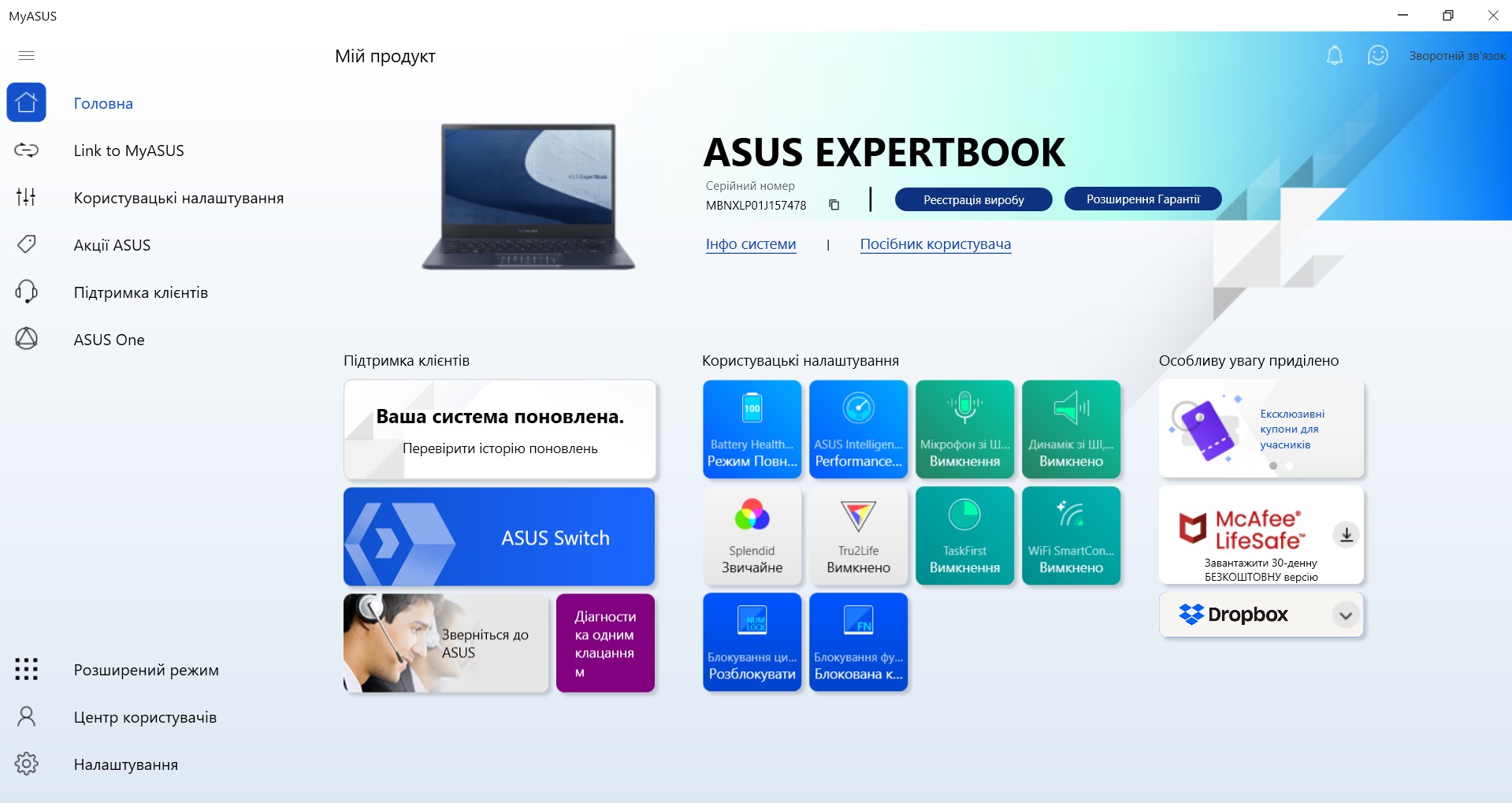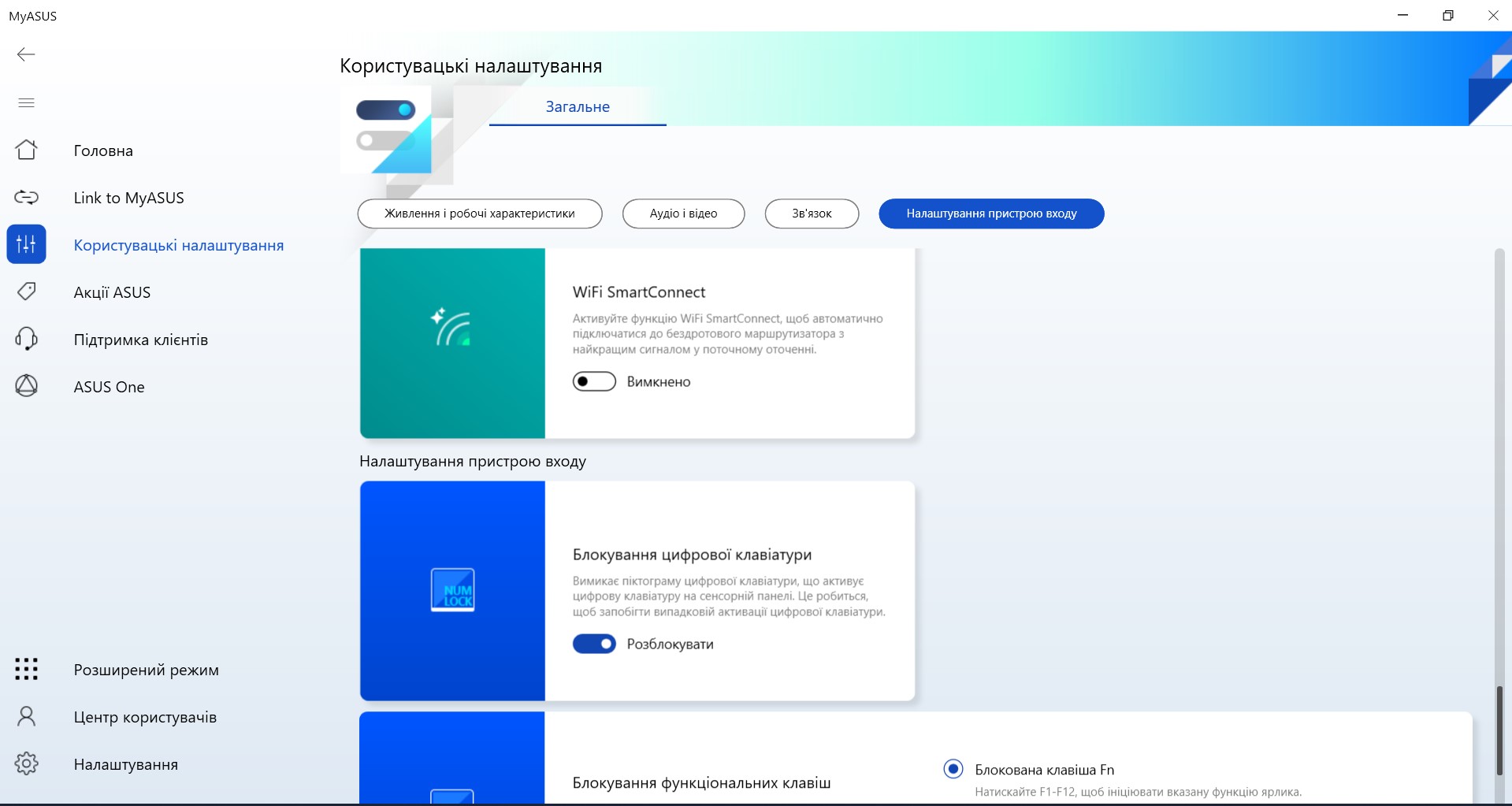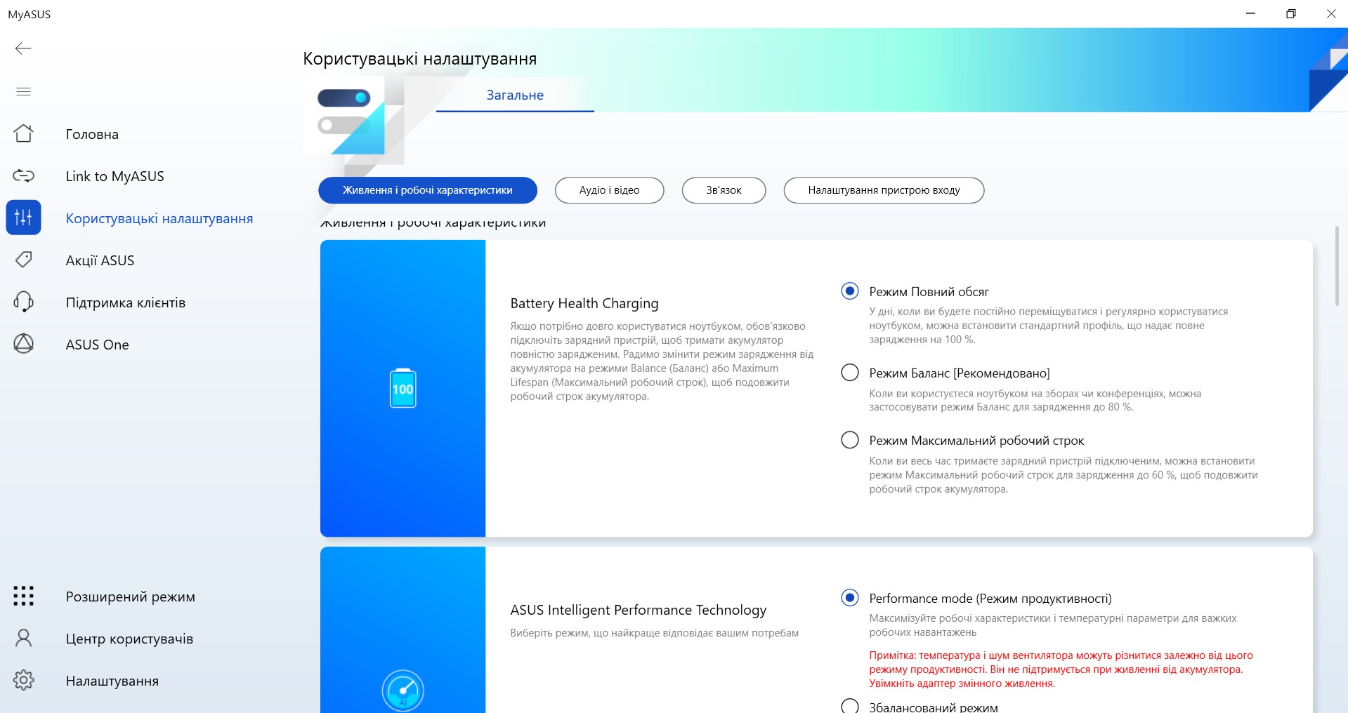 Zestaw autorskiego oprogramowania składa się z kilku aplikacji. Głównym z nich jest MyASUS, który jest stosowany we wszystkich laptopach firmy. Posiada standardową funkcjonalność dla takich zastosowań: monitorowanie systemu, przełączanie trybów wydajności i ładowania, aktualizacja systemu, ustawienie funkcjonalnego rzędu klawiszy, redukcja szumów AI.