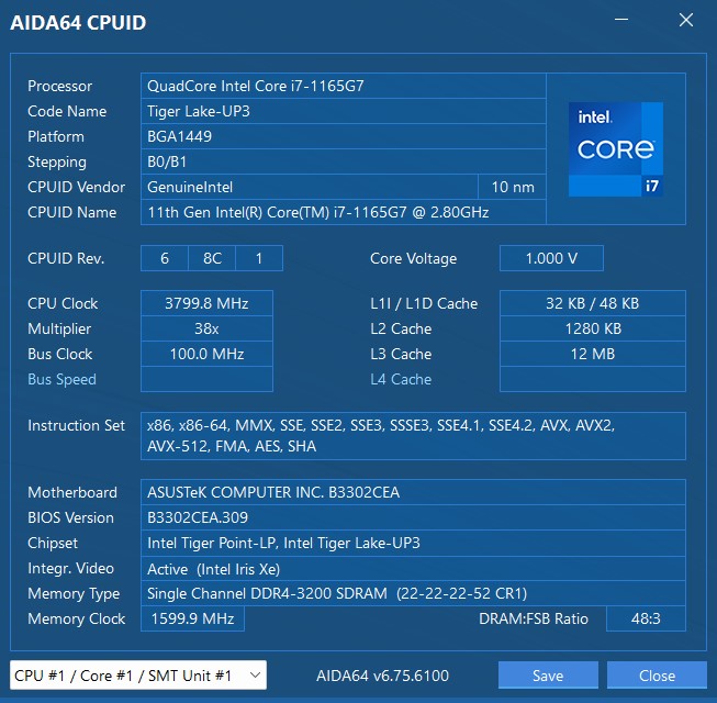 Laptop ASUS ExpertBook B5 (B5302CE) spełnia wymagania certyfikacyjne programu Intel Evo. Wskrócie, wymagania te obejmują conajmniej 9 godzin pracy na baterii, wsparcie dla szybkiego ładowania, rozdzielczość wyświetlacza nie niższą niż FullHD, wsparcie dla Wi-Fi 6 oraz Thunderbolt 4 .ASUS ExpertBook B5 (B5302CE) posiada procesory Intel Tiger Lake Core i5 oraz i7 11. generacji. W naszej konfiguracji zastosowano znany już procesor Intel Core i7-1165G7. Jest to czterordzeniowy, ośmiowątkowy procesor 10nm SuperFin o bazowej częstotliwości od 1,2 do 2,8 GHz w zależności od TDP. W trybie Turbo Boost częstotliwość ta może osiągnąć 4,7 GHz. TDP wynosi do 28 watów. Wbudowany akcelerator graficzny - Intel Iris Xe, posiada 96 jednostek wykonawczych, maksymalna częstotliwość może osiągnąć 1300 MHz. Nie ma dyskretnej grafiki, co jest oczywiste, biorąc pod uwagę klasę tego laptopa. Pamięć RAM - 16 GB DDR4-3200 MHz jest wlutowane na płycie. Dla pamięci RAM jest jeden wolny slot SO-DIMM, w sumie obsługiwane jest do 48 GB. Interfejsy bezprzewodowe: Wi-Fi 802.11 ax (Wi-Fi 6) i Bluetooth 5.0.