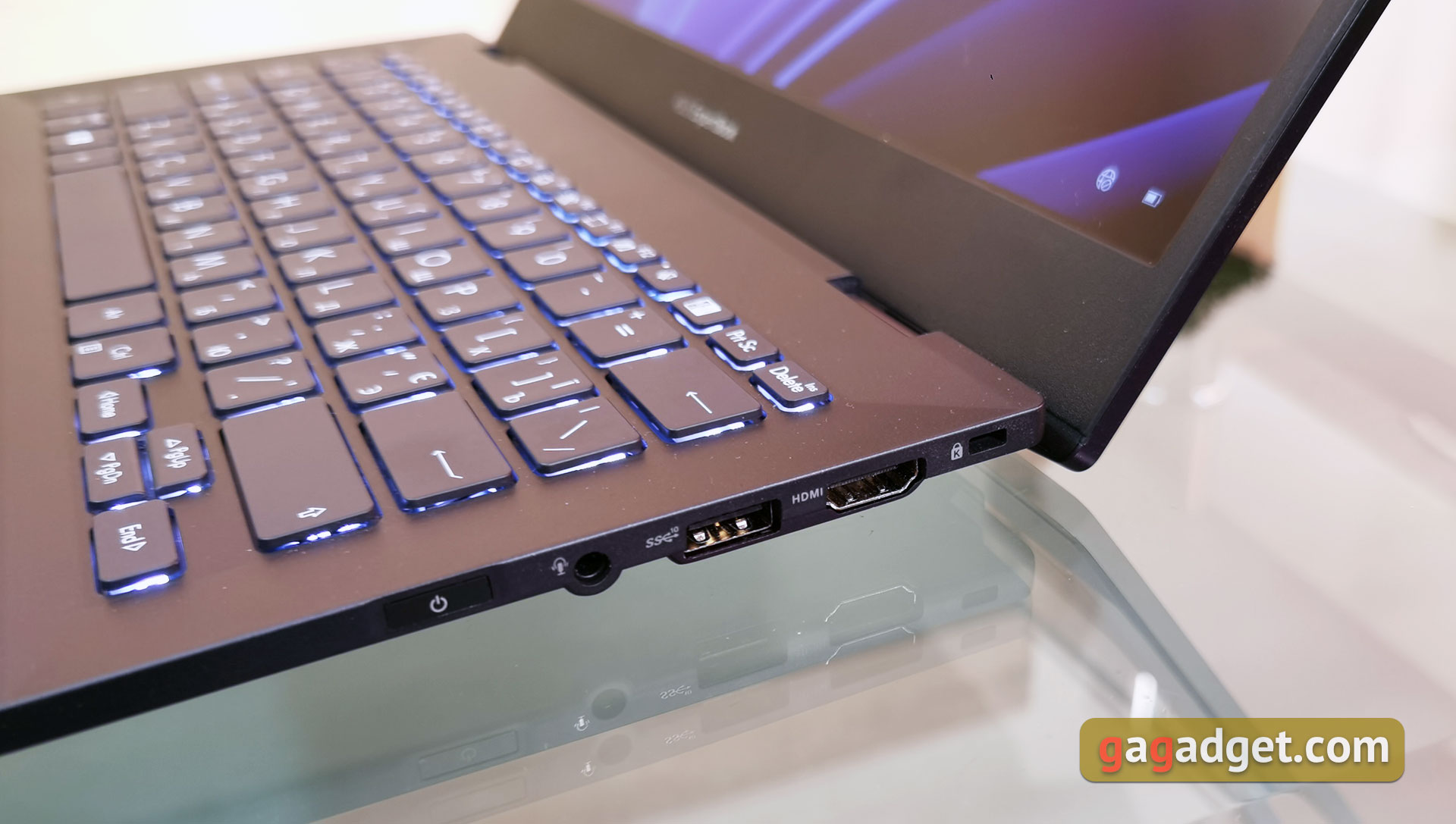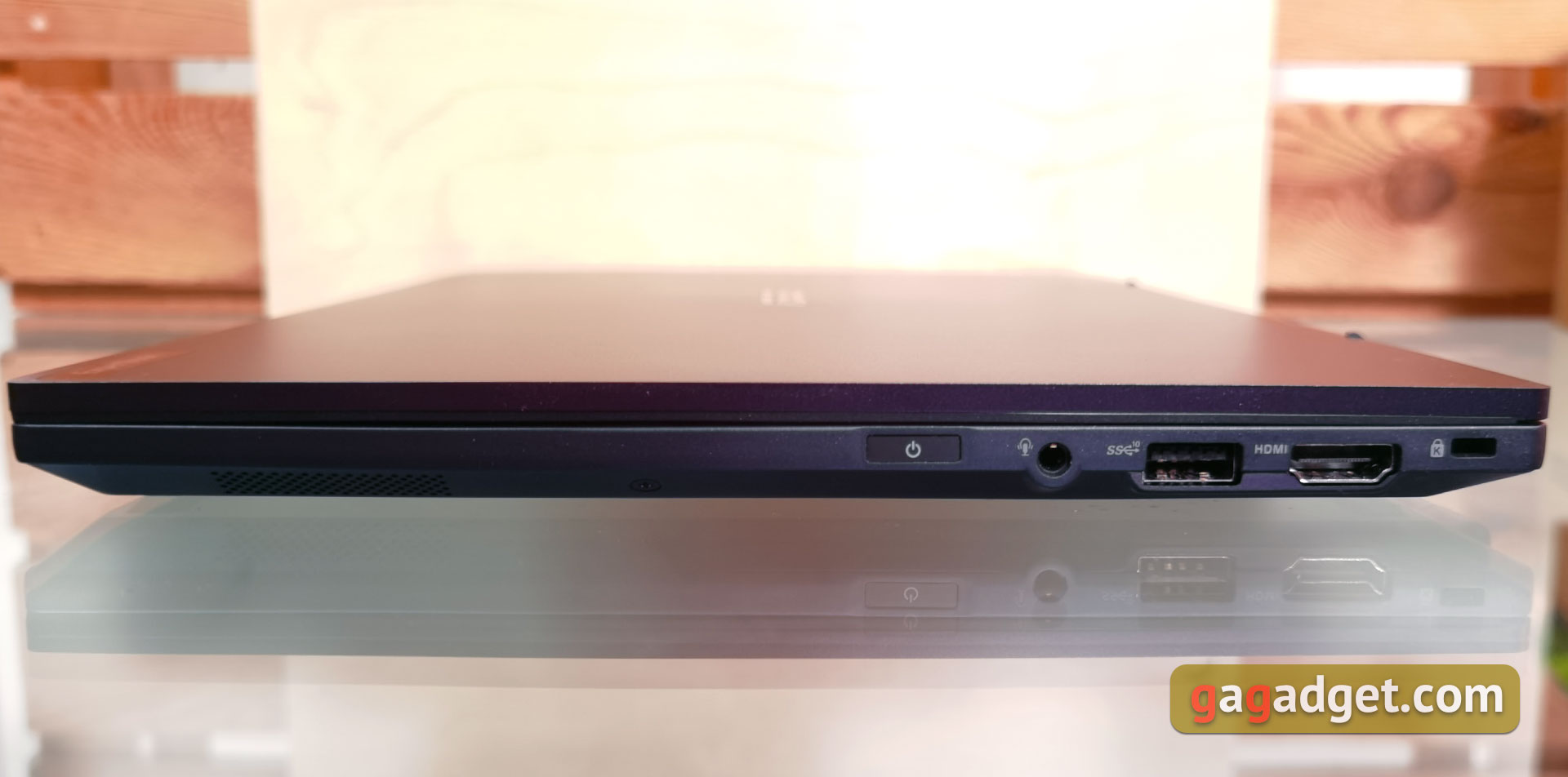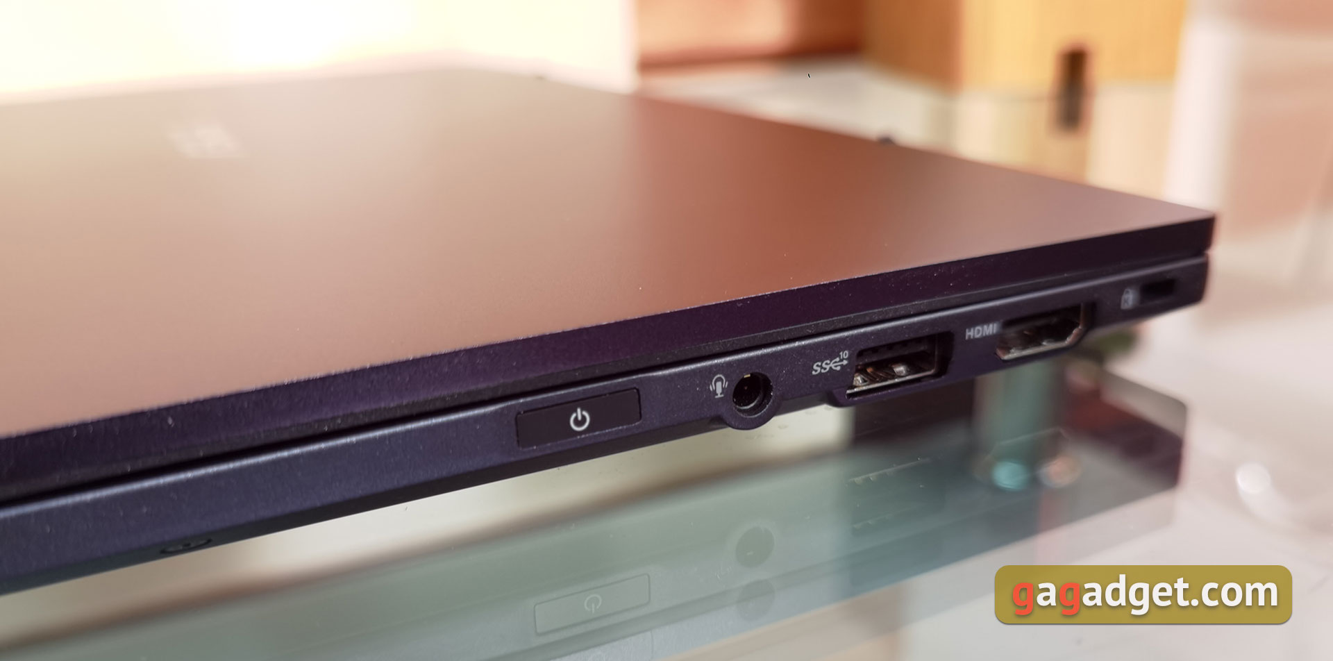 Biorąc pod uwagę, że ASUS ExpertBook B5 to 13,3-calowy laptop ultraprzenośny, liczba portów jest całkiem dobra. Na prawym boku znajduje się blokada Kensington Lock, pełnowymiarowe HDMI 2.0 i USB 3.2 Gen 2 Type-A, zespolony jack audio 3,5 mm oraz przycisk zasilania z wbudowanym skanerem linii papilarnych.