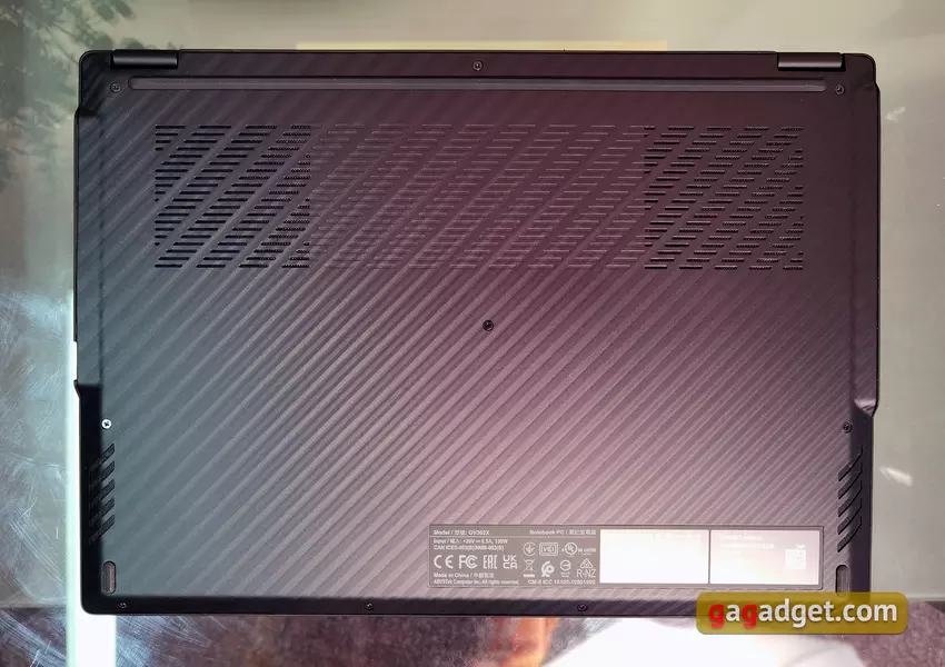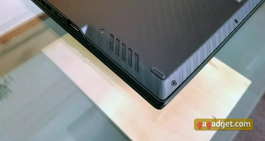 Spód laptopa jest dość standardowy: gumowe nóżki, otwory wentylacyjne nad dwoma wentylatorami chłodzącymi, głośniki stereo, które są lekko nachylone do powierzchni i śruby mocujące dolną pokrywę. Nie jest trudno ją zdjąć, ale nie ma większego sensu tego robić. Jest to ultrabook, więc opcje aktualizacji są minimalne. Pamięć RAM jest wlutowana na płycie, a dostęp do niej mają tylko karta sieciowa i dysk SSD M.2 2230. 16-calowy ROG Flow X16 ma miejsce na dodatkowy dysk SSD. ASUS ROG Flow X13 nie ma na niego miejsca.