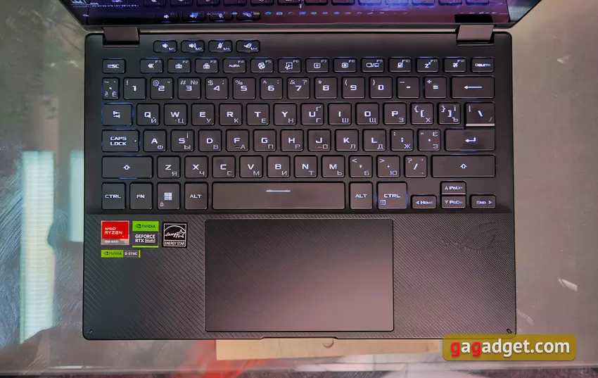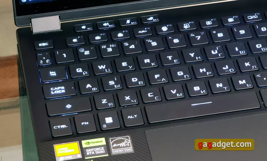 Układ klawiatury jest typowy dla laptopów ASUS ROG: standardowy pełnowymiarowy bez dodatkowego bloku numerycznego, ale z czterema dodatkowymi przyciskami nad głównym blokiem. Domyślnie odpowiadają one za głośność, wyciszenie mikrofonu i uruchomienie Armoury Crate. Możliwe jest również przypisanie do nich makr. Kilka przycisków funkcyjnych i blok strzałek mają zmniejszoną wysokość. Zarówno Shift, jak i Enter są długie, a Enter jest jednopoziomowy. Dla użytkowników ultrabooków klawiatura będzie więc całkowicie znajoma.