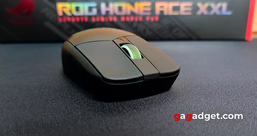 Pomimo symetrycznego kształtu, dodatkowe przyciski znajdują się tylko po lewej stronie myszy, więc można z niej w pełni korzystać tylko prawą ręką. Przyciski są szerokie i mają wyraźny odstęp. Nie ma gumowych podkładek; są małe ukośne nacięcia w pobliżu przedniej części boków dla lepszej przyczepności. Po prawej stronie znajduje się logo ROG.