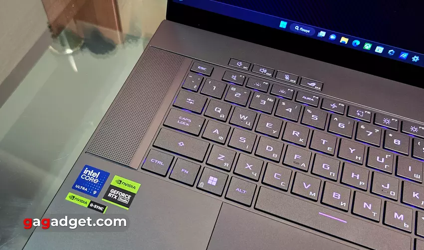 Porozmawiajmy teraz o komponentach i wydajności ASUS ROG Zephyrus G16 (2024). Jak wspomniano powyżej, cienka i lekka obudowa zmusiła firmę do pójścia na pewne kompromisy. Dotyczy to zarówno procesora, jak i karty graficznej. Zwykle nowoczesne topowe modele do gier są zasilane przez potężne procesory Intel 14. generacji z serii HX. W naszym przypadku używamy nowego Intel Core Ultra z rodziny Meteor Lake, a mianowicie Intel Core Ultra 9 185H, który niedawno sprawdziliśmy w naszej recenzji ultraprzenośnego laptopa ASUS Zenbook 14 OLED (UX3405). Dla przypomnienia, procesor posiada nową wbudowaną grafikę opartą na architekturze Arc, a także oddzielny neuroprocesor Intel AI Boost NPU, który ma być wykorzystywany do wszystkich operacji AI i uczenia maszynowego. Procesor jest produkowany przy użyciu technologii procesowej Intel 4 (7 nm) i ma łącznie 16 rdzeni. 6 wydajnych rdzeni pracujących z częstotliwością 2,3-5,1 GHz, 8 energooszczędnych 1,8-3,8 GHz oraz 2 ultrawydajne rdzenie 1-2,5 GHz. Obsługiwanych jest do 22 wątków obliczeniowych. Akcelerator graficzny Arc ma 8 rdzeni Xeo częstotliwości do 2,35 GHz. Maksymalna częstotliwość Intel AI Boost NPU wynosi 1,4 GHz. Poziom TDP procesora to 28-45 W. Pamięć RAM - 32 GB LPDDR5X 7467 (2x16 GB), pracuje w trybie dwukanałowym. Niestety znajduje się na płycie, więc nie ma możliwości rozbudowy lub wymiany. Interfejsy bezprzewodowe: Bluetooth 5.3 i szybki Wi-Fi 6E (802.11ax) (triple-band) 2x2. Zastosowany dyskretny akcelerator wideo to topowy NVIDIA GeForce RTX 4090 Laptop, ale o raczej skromnej wartości TGP: do 115 W (95 W + 20 W Dynamic Boost). Częstotliwość wynosi oddo 1650 MHz i podbicie do 1700 MHz. Dla porównania, GeForce RTX 4090 Laptop w ASUS ROG Strix SCAR 18 (2024) miał standardowy poziom TGP do 150 W i ROG Boost 175 W. Pojemność pamięci wideo 16 GB GDDR6. Laptop jest wyposażony w multiplekser MUX Switch do bezpośredniego połączenia karty graficznej z wyświetlaczem w celu zmniejszenia opóźnień i zwiększenia wydajności. Obsługuje technologię NVIDIA Advanced Optimus do automatycznego przełączania MUX Switch.