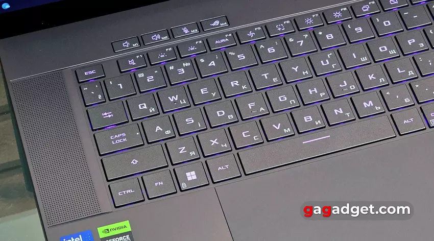 Laptop wykorzystuje ukryty zawias, tak zwany Stealth Hinge. Maksymalny kąt otwarcia laptopa wynosi około 135°. Na wypadek, gdyby ktoś naprawdę potrzebował 180°, ASUS wyjaśnia, że musiał z niego zrezygnować, aby nie zakrywać niektórych otworów wentylacyjnych. W przeciwnym razie konstrukcja jest dość znana z innych modeli ASUS: w pozycji otwartej tył powierzchni roboczej jest nieco uniesiony nad stołem. Przyczynia się to również do lepszego chłodzenia komponentów ze względu na większą przestrzeń poniżej. Klawiatura jest dość typowa dla ultrabooków ASUS: pełnowymiarowa, bez dodatkowego bloku numerycznego. Nad jednostką główną znajdują się cztery dodatkowe przyciski, typowe dla modeli gamingowych. Odpowiadają one za głośność, wyciszenie mikrofonu oraz uruchomienie autorskiej aplikacji Armoury Crate. Dla przycisków tych można skonfigurować makra. Przycisk zasilania również znajduje się nad głównym blokiem klawiszy, a jego przypadkowe naciśnięcie będzie niezwykle trudne. Górny rząd klawiszy funkcyjnych został zmniejszony, podobnie jak blok nawigacyjny. Obie zmiany są długie. Układ nie wymaga dodatkowego czasu na przyzwyczajenie się.