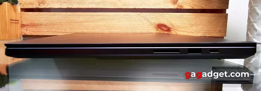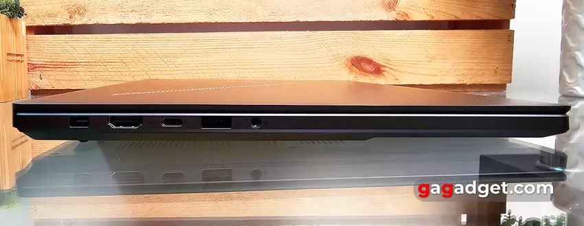 Wszystkie złącza znajdują się z boku, tył jest zarezerwowany dla chłodzenia. Po lewej stronie laptop ma zaktualizowane, własne prostokątne złącze zasilania, wyjście wideo HDMI 2.1 FRL, Thunderbolt 4 (z obsługą DisplayPort dla zintegrowanej grafiki i 100W Power Delivery), pełnowymiarowe USB Type-A 3.2 Gen 2, a także gniazdo audio 3,5 mm.