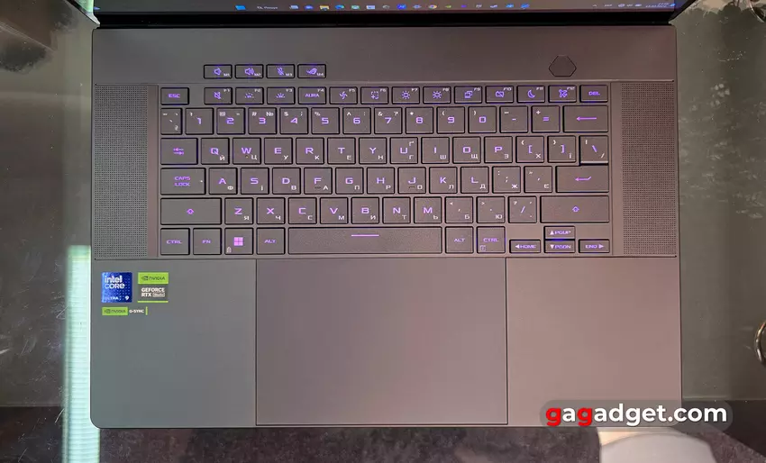 ASUS ROG Zephyrus G16 (2024) nie wygląda jak klasyczny laptop gamingowy. W przeciwieństwie do zwykłych potężnych laptopów do gier, jest cieńszy, bardziej stylowy, schludniejszy i nie ma plastikowych części. Obudowa została wykonana w całości z metalu przy użyciu maszyny CNC. Takie rozwiązania są najczęściej stosowane w produkcji ultrabooków. Jedynie przyciski klawiatury wykonane są z tworzywa sztucznego. Sama klawiatura nie zajmuje całej szerokości laptopa; po jej bokach znajdują się dwa podwójne głośniki.