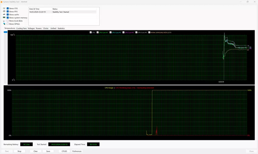 Test obciążeniowy AIDA64 wykazał, że przy maksymalnym obciążeniu komponenty początkowo nagrzewają się do 105° , a dławienie obserwuje się przy około 20%. Następnie temperatura utrzymuje się w zakresie 75-80°, a laptop działa stabilnie. Poziom hałasu przy maksymalnym obciążeniu jest więcej niż akceptowalny, standardowe inne modele są zwykle głośniejsze. W niektórych momentach, gdy nie ma obciążenia, układ chłodzenia przełącza się w tryb pasywny, choć zdarza się to rzadko. Klawiatura i zdecydowana większość powierzchni roboczej pozostają chłodne pod obciążeniem dzięki temu, że część zimnego powietrza jest zasysana przez klawiaturę.