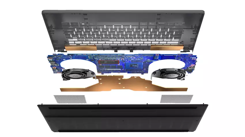 Inteligentny system chłodzenia ROG w ASUS ROG Zephyrus G16 (2024) obejmuje masywny radiator, dużą komorę parowania i dwa wentylatory Arc Flow drugiej generacji. Ciekły metal Thermal Grizzly jest tradycyjnie używany jako interfejs termiczny.