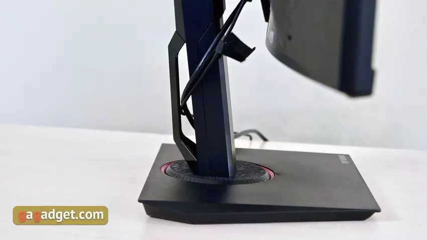 Stojak ma masywny, trapezoidalny kształt. Ma metalową podstawę (dla większej wagi i stabilności), a na zewnątrz - matowy czarny plastik. Z przodu znajduje się małe logo linii TUF Gaming, a na środku znajduje się okrągła, przewijana podstawa stojaka ze skomplikowanym wzorem. Wzdłuż obwodu jest czerwona ramka i nacięcia. Na środku stojaka przed podstawą znajduje się również jedno wycięcie. Wydaje się, że dzieje się tak w przypadku najbardziej ideologicznych perfekcjonistów, którzy chcą ustawić monitor idealnie równo: