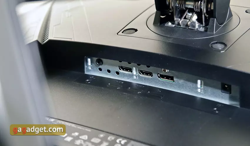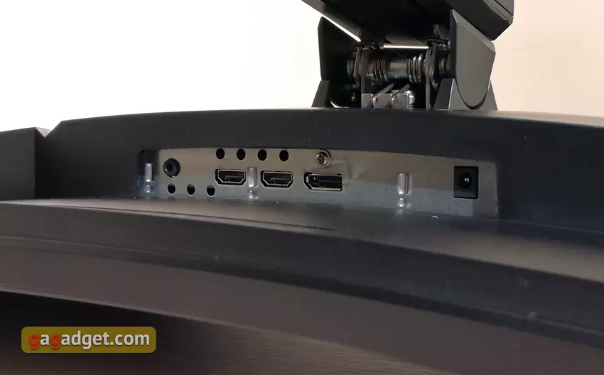 Na monitorze nie ma wielu złączy, ale jest wszystko, czego potrzebujesz. Gniazdo słuchawkowe, dwa HDMI 2.0, jeden DisplayPort 1.2 i gniazdo zasilania. Dla pełnego szczęścia brakuje koncentratora USB. Ale przed nami jest niedrogie rozwiązanie, więc jest to usprawiedliwione: