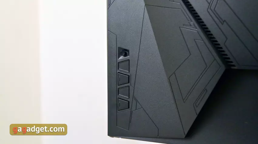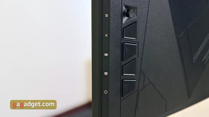Jest to standard dla wszystkich (lub prawie wszystkich) gaming monitorów ASUS. To jest - pięciokierunkowy joystick oraz cztery przyciski fizyczne poniżej trapezu. Na skos umieściły ikony z wartościami funkcji przycisków. Nie jest to dobre umieszczenie: trzeba przekręcać monitor by je zobaczyć: