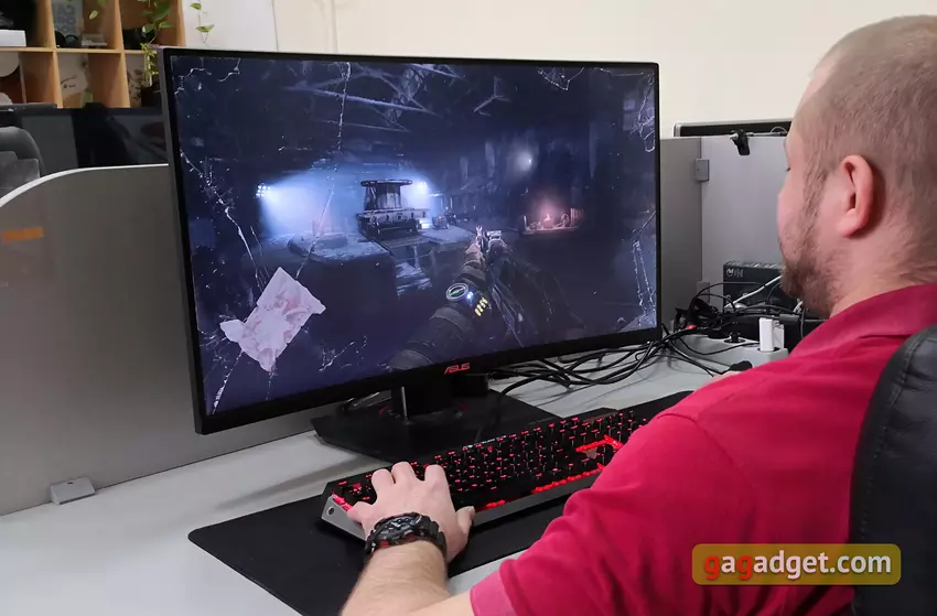Jeśli chodzi o gry, ASUS TUF Gaming VG32VQ ma wszystko, czego potrzebujesz: imponującą przekątną z obecnie optymalną (moim subiektywną opinią) rozdzielczością 2560x1440, maksymalną częstotliwością odświeżania 144 Hz oraz szereg przydatnych funkcji, w tym podkręcanie matrycy, wsparcie dla synchronizacji klatek FreeSync i własny ELMB Sync (Extreme Low Motion Blur Sync), który może działać jednocześnie. W rezultacie nawet w najszybszych i najbardziej dynamicznych strzelankach obraz jest bardzo płynny, bez przerw, pętli i żadnych zauważalnych artefaktów. Oczywiście, jeśli sprzęt pasuje. Warto jednak pamiętać o jednym ważnym punkcie: przy aktywnej funkcji ELMB podświetlenie działa w trybie PWM, a przy niskiej jasności migotanie może męczyć oczy. Możliwe jest również, że ktoś przyda się z dodatkowymi funkcjami GamePlus, zwłaszcza licznikiem FPS. Osobiście nie znalazłem żadnego zastosowania dla zakresu i timera dla siebie, ale jestem pewien, że przyda się komuś. Niewielkim, ale miłym dodatkiem jest obecność wbudowanych głośników stereo. Tak, nie mogą się pochwalić imponującą głośnością ani super jakością. Ale w niektórych przypadkach mogą być przydatne. Na przykład po podłączeniu PS4 Slim, który jest pozbawiony optycznego wyjścia audio.