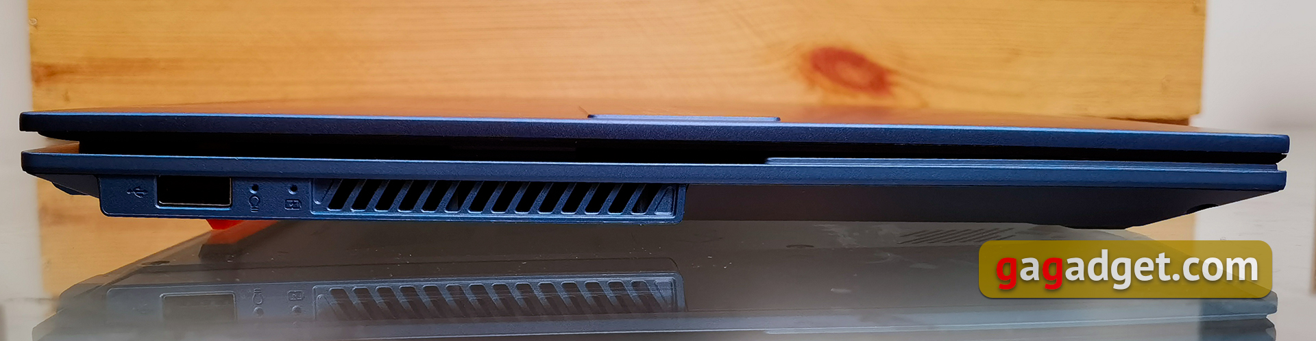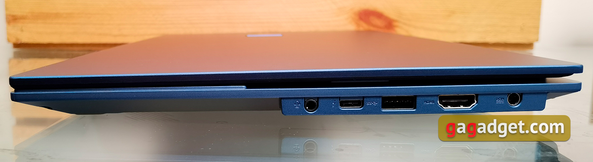 Po prawej stronie znajduje się połączone gniazdo audio 3,5 mm, HDMI 1.4, USB 3.2 Gen 1 Type-A, gniazdo zasilania i USB Type-C (Thunderbolt 4, 40 Gb / s z Display Port i Power Delivery). Laptop może być również zasilany przez jednostki 100W Type-C. Biorąc pod uwagę wymiary, zestaw złączy nie jest imponujący. Przydałby się czytnik kart pamięci. Trochę dziwnie wyglądają też porty HDMI 1.4 i USB 2.0.