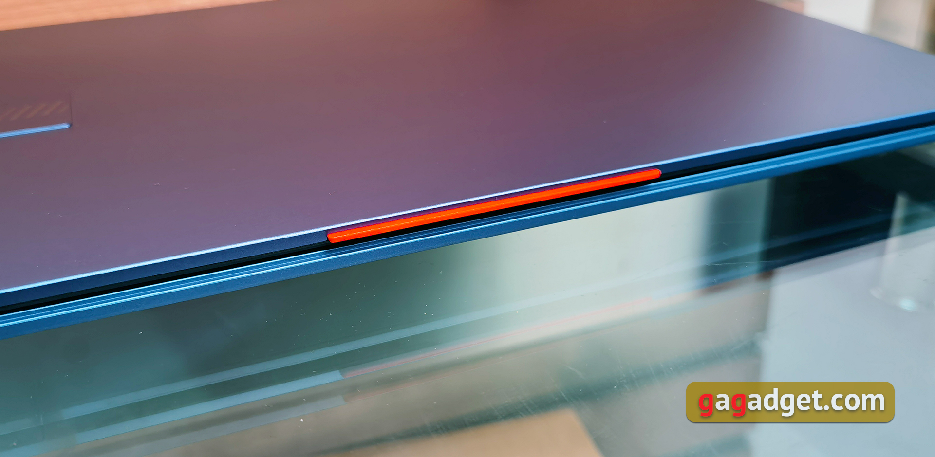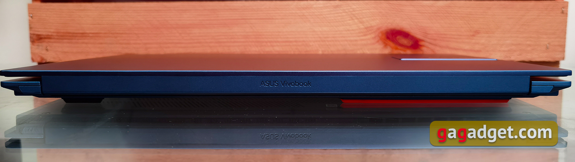 Zamiast zwykłego wycięcia do otwierania laptopa, ASUS Vivobook S 15 OLED ma jasnopomarańczowy występ na górnej pokrywie.