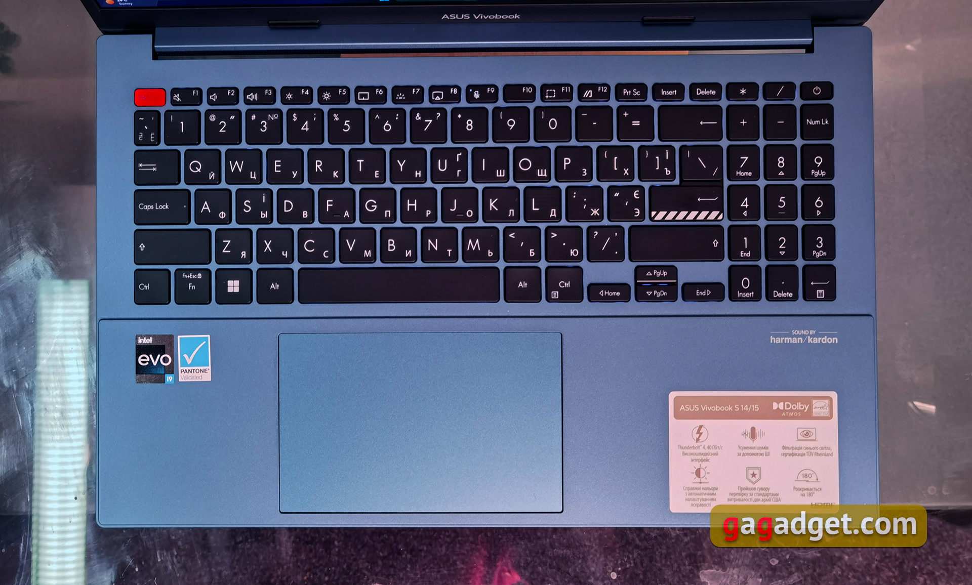 ASUS Vivobook S 15 OLED wykorzystuje standardowy układ klawiatury z dodatkowym blokiem numerycznym. Może to być przydatne dla tych, którzy dużo pracują w Excelu lub używają go do wprowadzania znaków specjalnych. Klawiatura numeryczna nie jest oddzielona od klawiatury głównej. Zarówno Shift, jak i Enter są długie. Blok strzałek i górny rząd przycisków funkcyjnych są mniejsze. Rząd kończy się przyciskiem zasilania, który ma wbudowany skaner linii papilarnych. Układ jest całkiem wygodny, choć blok strzałek mógłby być nieco większy.