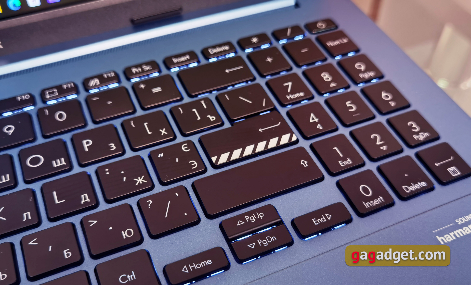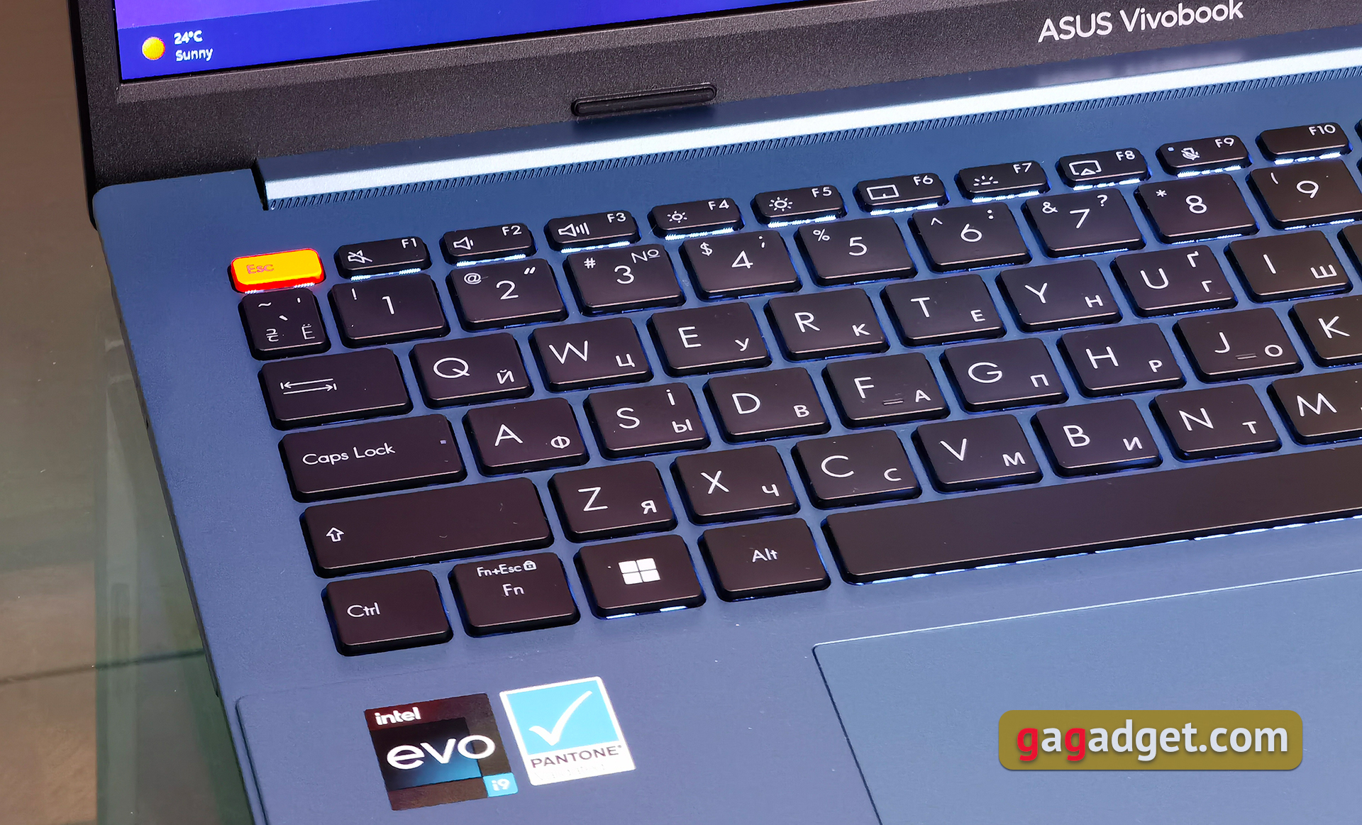 Rozstaw klawiszy klawiatury ErgoSense wynosi 19,05 mm. Są one lekko wklęsłe o 0,2 mm i mają pełny skok 1,4 mm. Jest dość wygodna w użyciu. Posiada białe podświetlenie z trzema poziomami jasności. Oprócz pomarańczowego przycisku Esc, klawisz Enter jest oznaczony ukośnymi białymi paskami, co również jest typowe dla linii Vivobook.