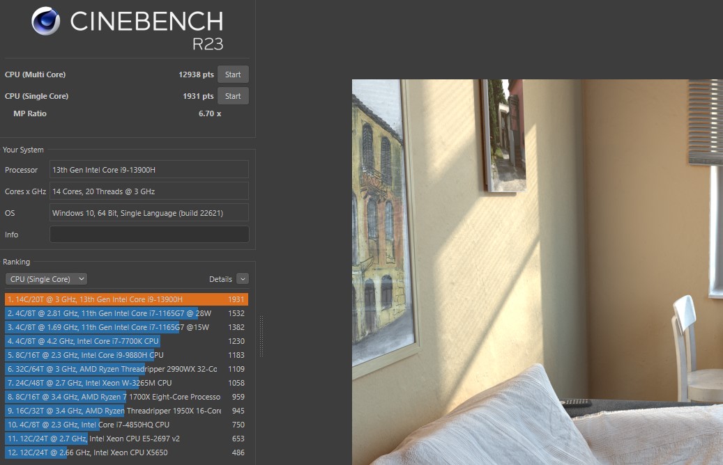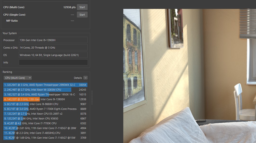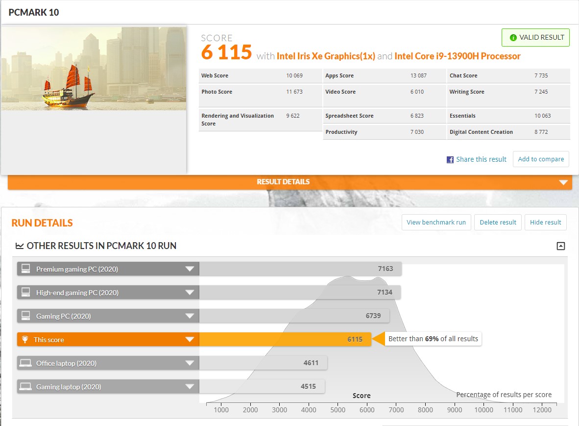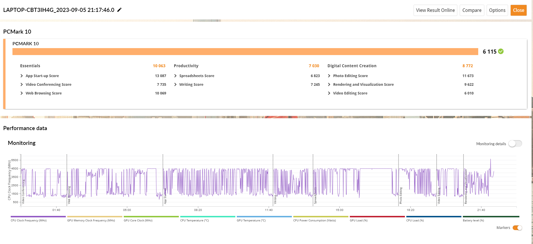 Laptop wykorzystuje bardzo wydajny procesor Intel Core i9, choć nie o najwyższym TDP. Wykazuje on jednak bardzo wysoką wydajność w odpowiednich testach syntetycznych. Układ graficzny Intel Arc A350M jest rzeczywiście znacznie wydajniejszy niż rozwiązania zintegrowane. Ogólnie rzecz biorąc, wydajność laptopa jest wystarczająca do ciężkich zadań, a także do obróbki zdjęć i wideo. Jednak do ciężkiej edycji 3D nadal powinieneś szukać czegoś z mocniejszą grafiką.