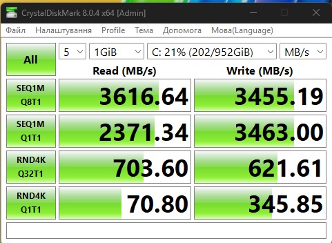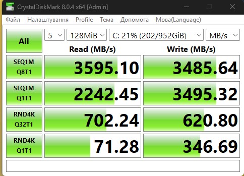 Prędkość odczytu wynosi około 3600 MB/s, a zapisu 3450 MB/s. Nie są to już rekordowe wartości, ale w zupełności wystarczają do komfortowej pracy, szybkiego uruchamiania systemu operacyjnego i aplikacji.