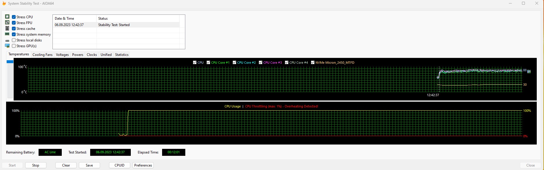 System chłodzenia ASUS IceCool obejmuje dwie rurki cieplne o średnicy 8 mm i 6 mm, a także tylko jeden wentylator IceBlade z 87 łopatkami. Zazwyczaj laptopy z tak potężnymi komponentami wykorzystują dwa wentylatory. Jak się jednak okazało, cooler ASUS Vivobook S 15 OLED radzi sobie ze swoim zadaniem. Test obciążeniowy AIDA64 wykazał, że temperatura podzespołów utrzymuje się na poziomie około 88° podczas długotrwałego użytkowania. Jednocześnie system działa stabilnie, procesor nie dławi się. Górna część powierzchni roboczej staje się ciepła, choć nie ma to wpływu na użytkowanie: klawiatura pozostaje zimna. Ale poziom hałasu przy takim obciążeniu jest dość wysoki.