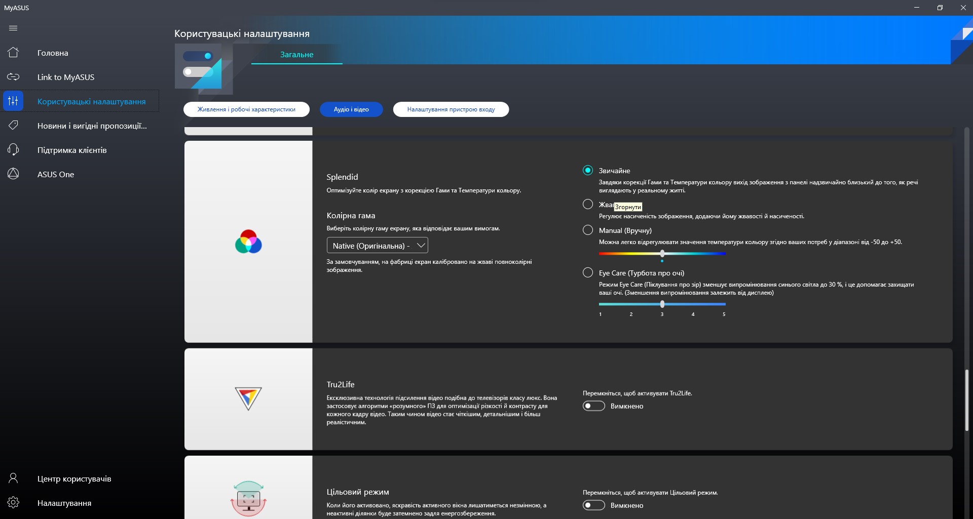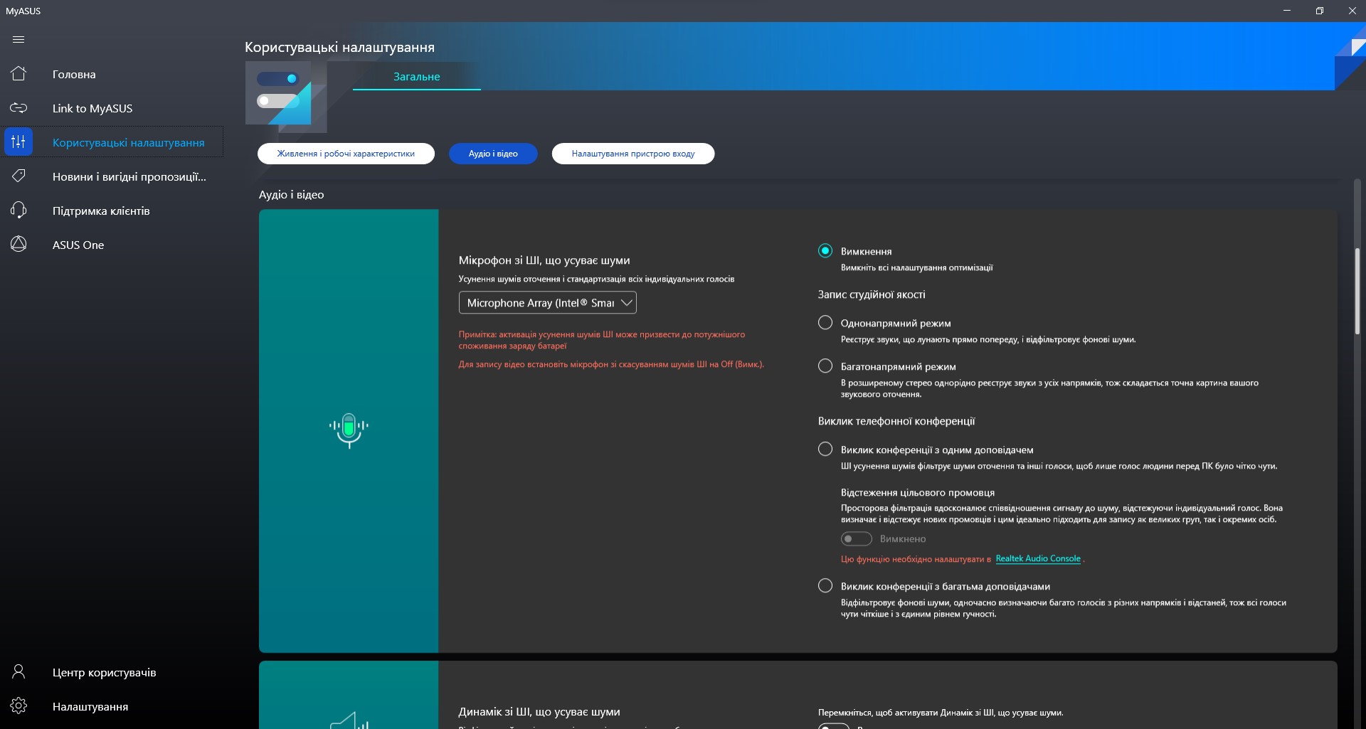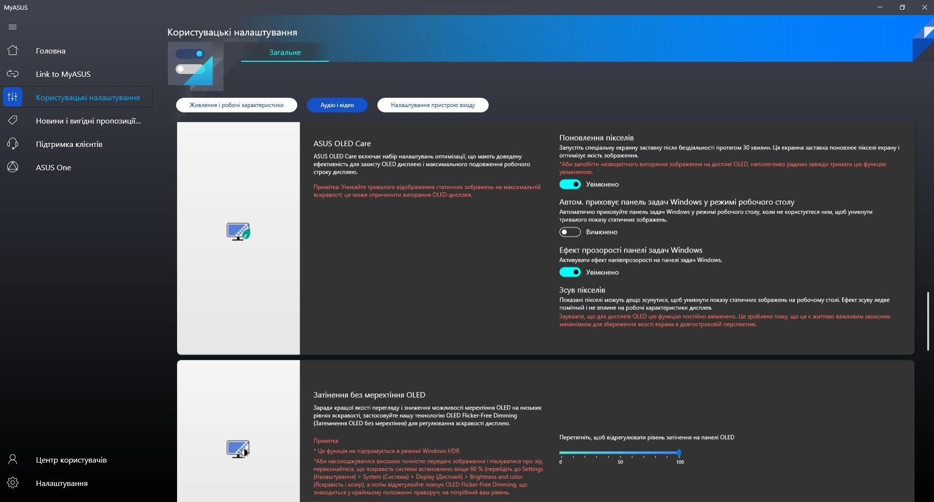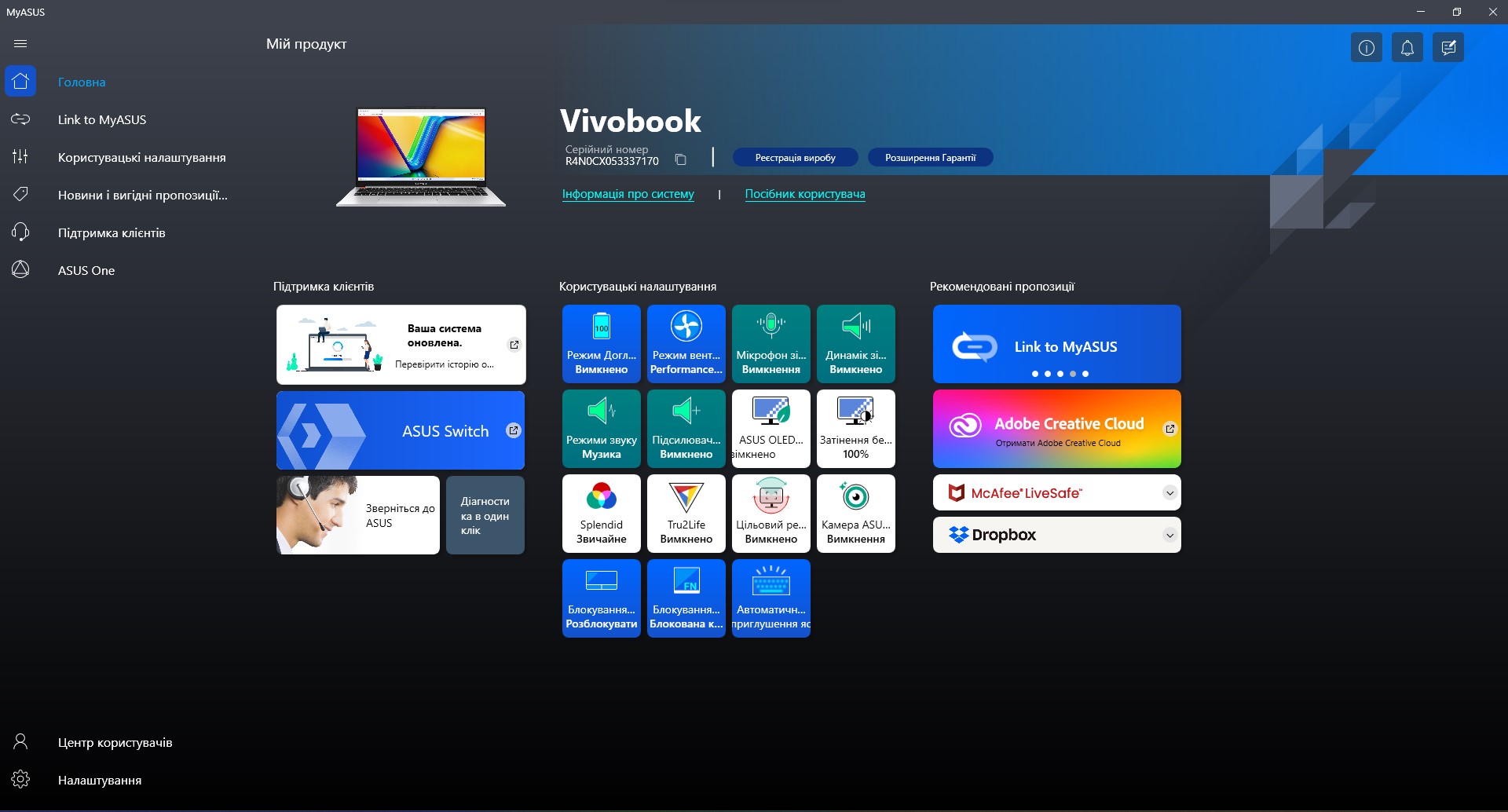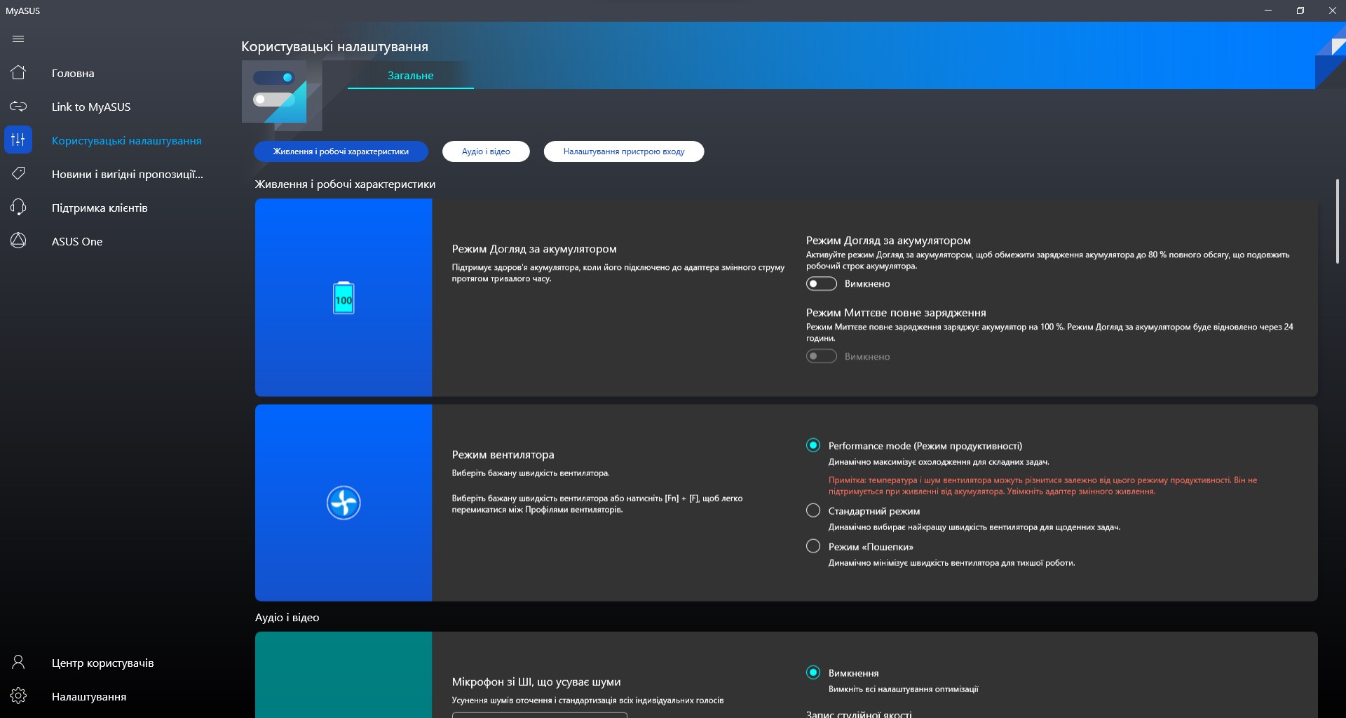 Preinstalowanym oprogramowaniem w laptopie jest znana aplikacja MyASUS. Odpowiada ona za wszystkie podstawowe ustawienia (w tym wydajność, ekran, redukcję szumów itp.), diagnostykę i aktualizacje systemu.