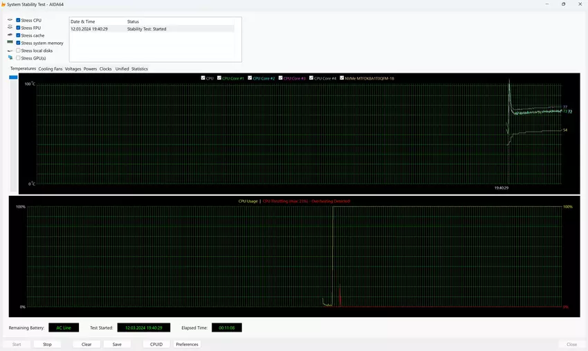 Laptop posiada aktywny system chłodzenia z pojedynczym wentylatorem, ale nie jest on słyszalny przy minimalnym obciążeniu. Test obciążeniowy w AIDA64 wykazał, że w trybie maksymalnej wydajności procesor może początkowo rozgrzać się do 105° (chociaż specyfikacja procesora wskazuje maksymalną dopuszczalną temperaturę 110°), przy 23% throttlingu. Następnie układ chłodzenia dostosowuje się, a temperatura podzespołów spada do średnio 77° i laptop działa stabilnie. Oczywiście słychać wentylator na maksymalnych obrotach. Poziom hałasu jest jednak niski i nie irytuje. Obudowa prawie nigdy się nie nagrzewa.