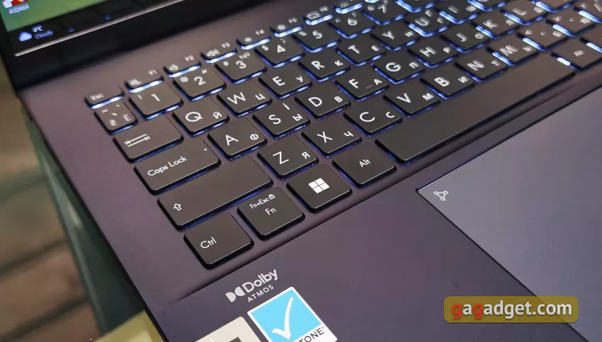 Klawiatura jest niemal typowa dla ultraportów ASUS-a. Bez dodatkowego bloku numerycznego, ze zmniejszonym górnym rzędem i blokiem strzałek. Górny rząd kończy się na Delete, a nie na przycisku zasilania. Robi się to, aby zapobiec przypadkowemu wyłączeniu. Sam przycisk zasilania jest lekko "zagłębiony" względem pozostałych klawiszy, ma wbudowany skaner linii papilarnych. Home, End, PgUp i PgDn są zdublowane strzałkami przez Fn. Oba klawisze Shift są długie, Enter jest jednopoziomowy.