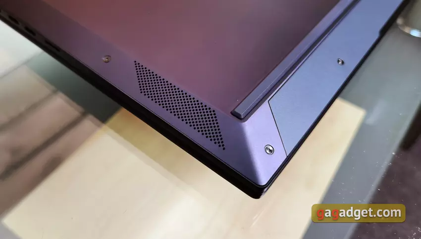 Laptop posiada głośniki stereo, które są ustawione pod kątem do powierzchni. Są wystarczająco dobre do filmów i teledysków, ale nie do słuchania muzyki. Niskie częstotliwości nie będą wystarczające.