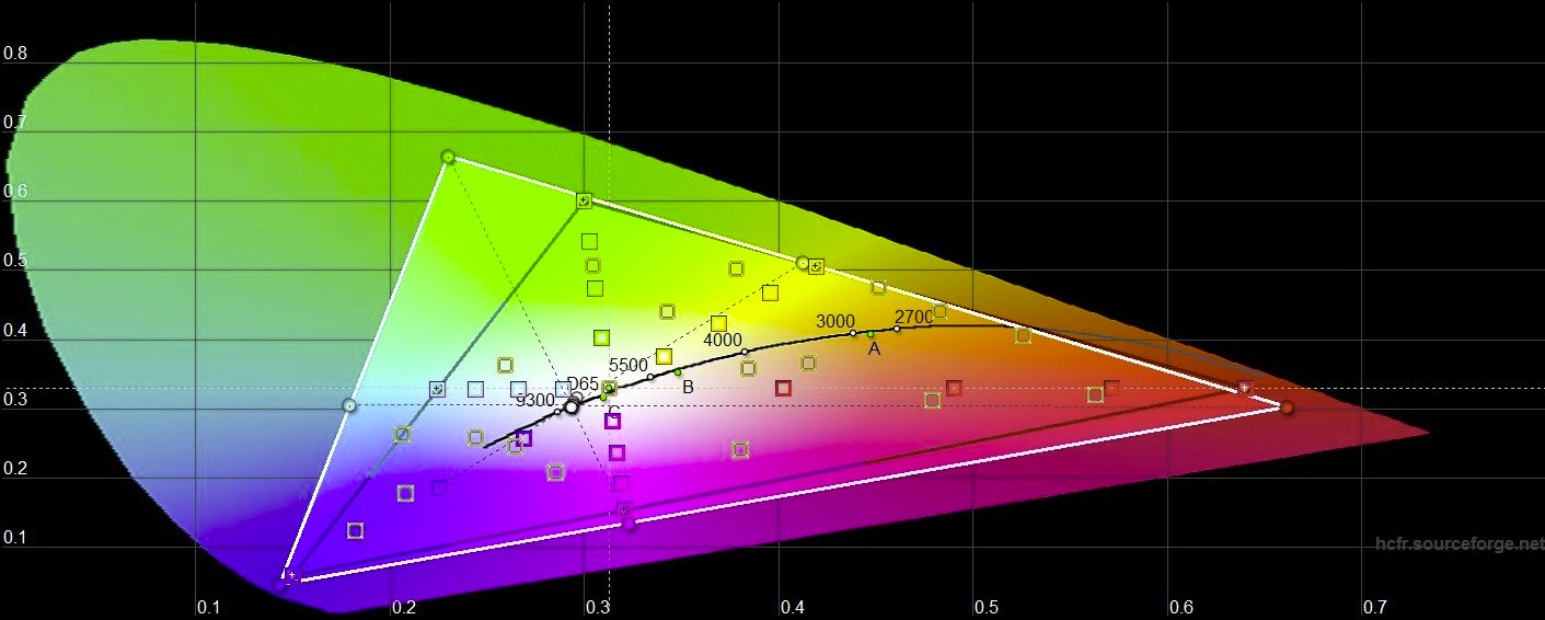 Jeśli oceniasz ekran wyłącznie na podstawie własnych wrażeń, to jest on świetny. Dotyczy to zarówno kolorów i marginesu jasności, jak i kątów widzenia. Według pomiarów kolorymetrem maksymalna jasność w trybie SDR wynosi 391,61 cd/m², czyli prawie deklarowane 400. Gama barwna ekranu jest znacznie szersza niż sRGB. A dokładność odwzorowania kolorów jest bliska wartościom referencyjnym: wyświetlacz tylko nieznacznie odchyla się w kierunku zimnych odcieni.