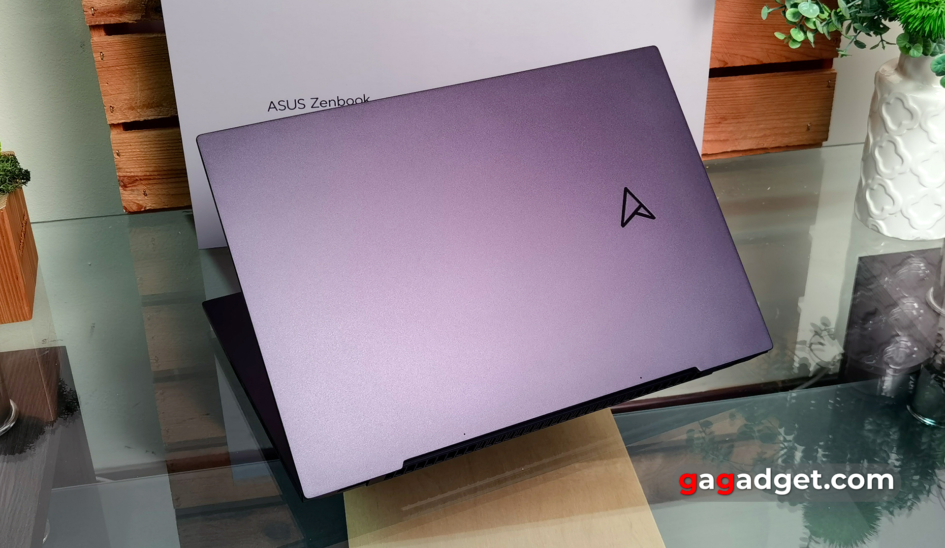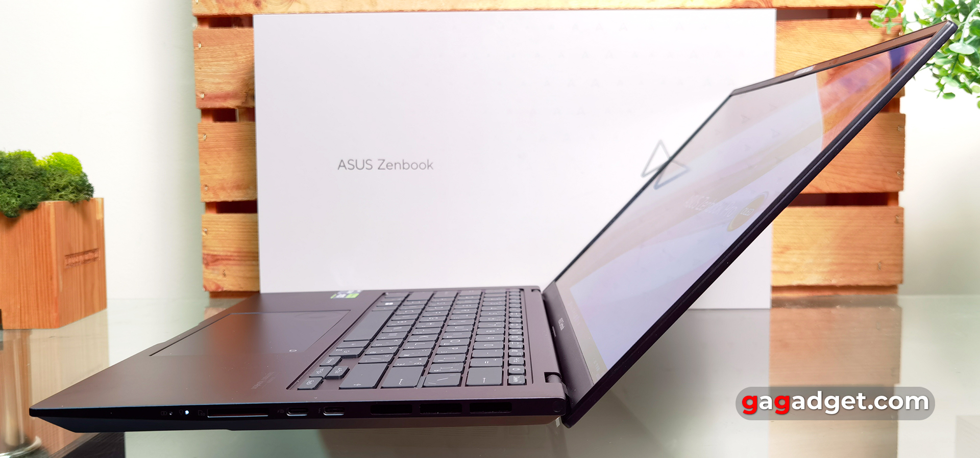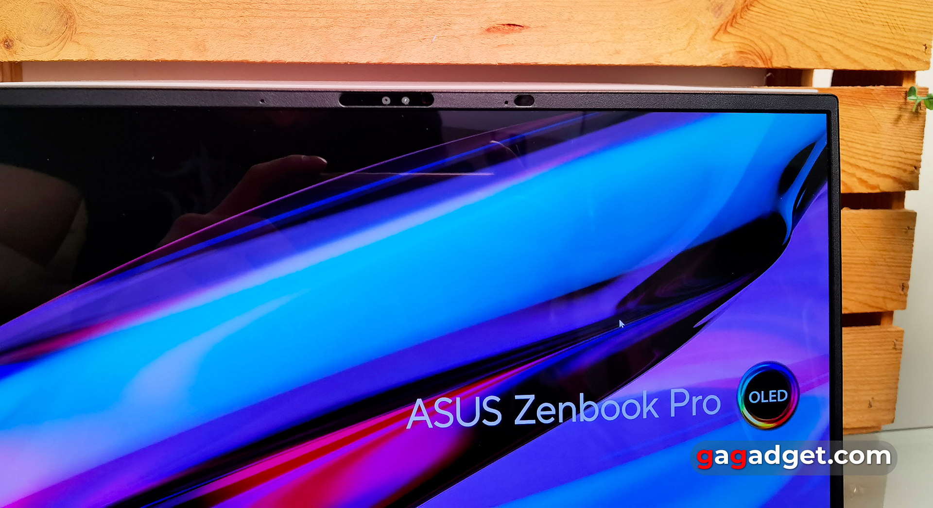 Ekran zajmuje 90% górnego panelu, a ramki są cienkie. Dostępne są konfiguracje ze zwykłym i dotykowym ekranem. W każdym razie panel jest chroniony przez Corning Gorilla Glass NBT, a odblaski są nieuniknione w słońcu lub jasnym świetle. Nad ekranem znajduje się kamera internetowa ze wskaźnikiem i mikrofonami, kamera na podczerwień do identyfikacji właściciela, czujnik światła do automatycznej regulacji jasności oraz czujnik RGB do automatycznej regulacji temperatury barwowej wyświetlacza w zależności od oświetlenia otoczenia. Kamera internetowa ma rozdzielczość FullHD i obsługuje zestaw zastrzeżonych funkcji ulepszania obrazu ASUS AiSense: rozmycie tła, korekcja jasności, korekcja kierunku oczu, śledzenie ruchu, filtry i technologia 3D Noise Reduction (3DNR) w czasie rzeczywistym.