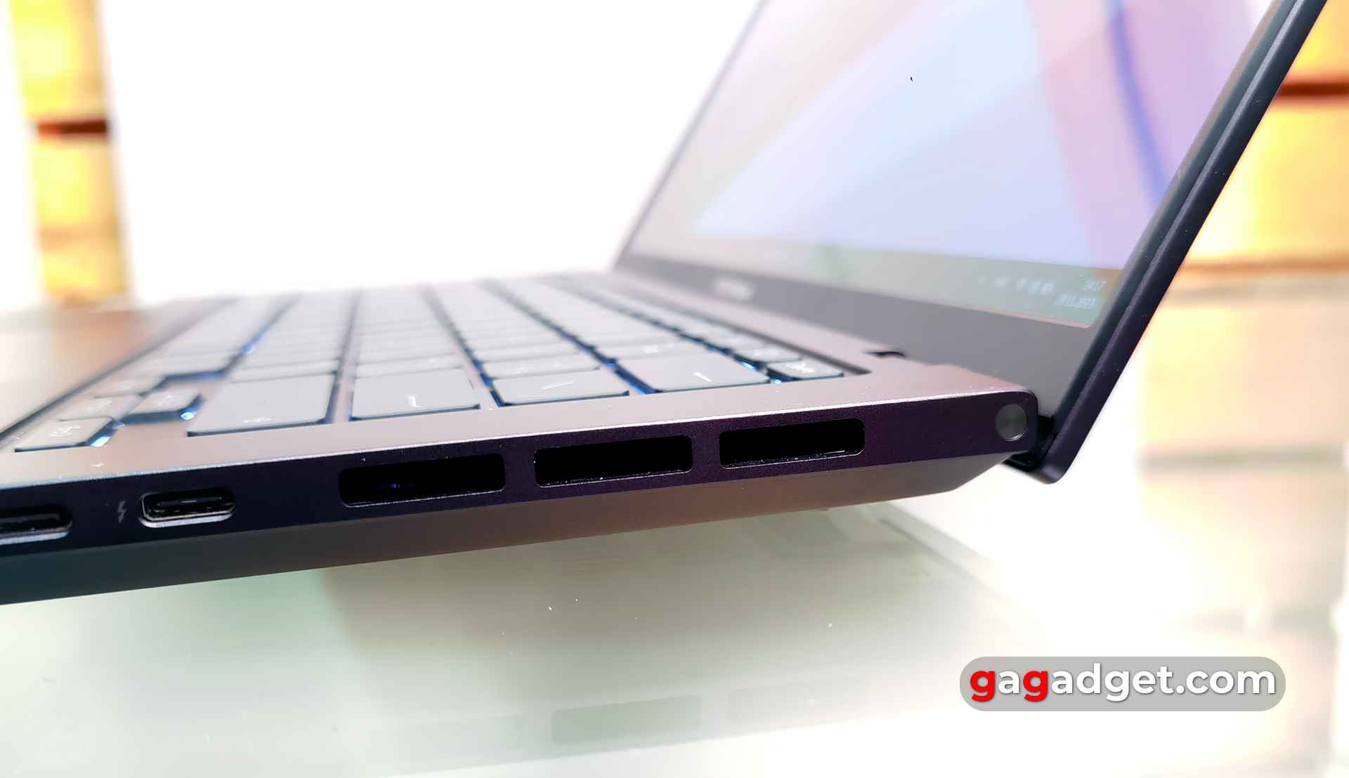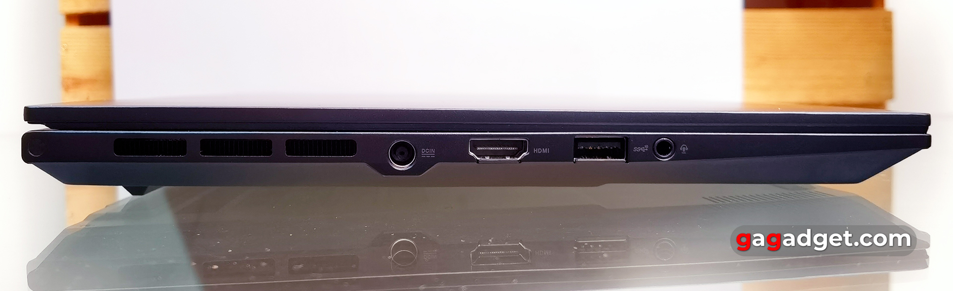 Laptop jest nieco grubszy niż większość ultraprzenośnych Zenbooków, co jest uzasadnione potężnymi komponentami w środku. Chociaż 18 mm to nie jest duża grubość. Nie ma tak wielu złączy, ale wszystko, czego potrzebujesz, jest tam. Po lewej stronie znajdują się otwory wentylacyjne, gniazdo zasilania, HDMI 2.1 FRL, USB 3.2 Gen 2 Type-A i standardowe gniazdo słuchawkowe 3,5 mm .