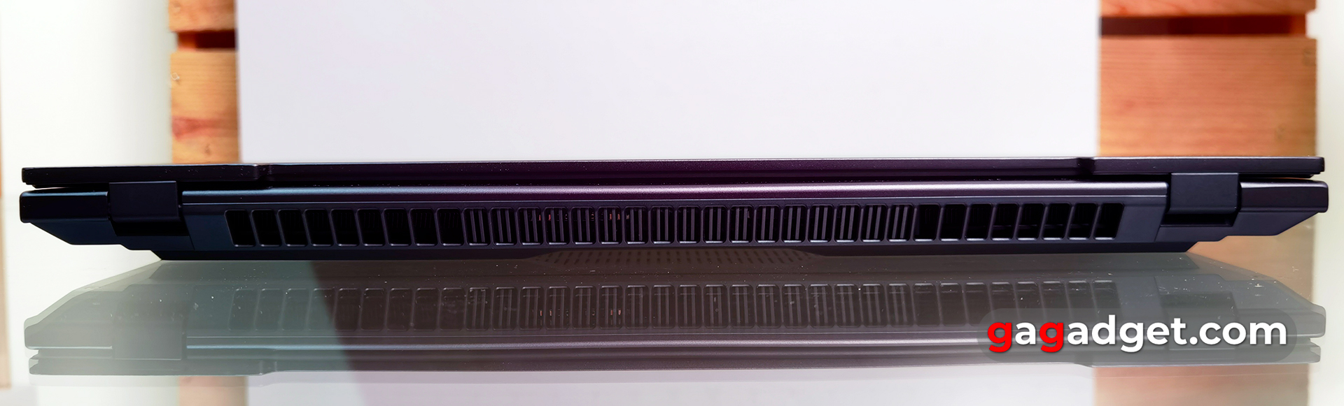 Przód jest typowy: tylko wycięcie ułatwiające podnoszenie pokrywy. Z tyłu znajdują się dwa zawiasy i duża liczba otworów wentylacyjnych, które zajmują większość całego tyłu laptopa.
