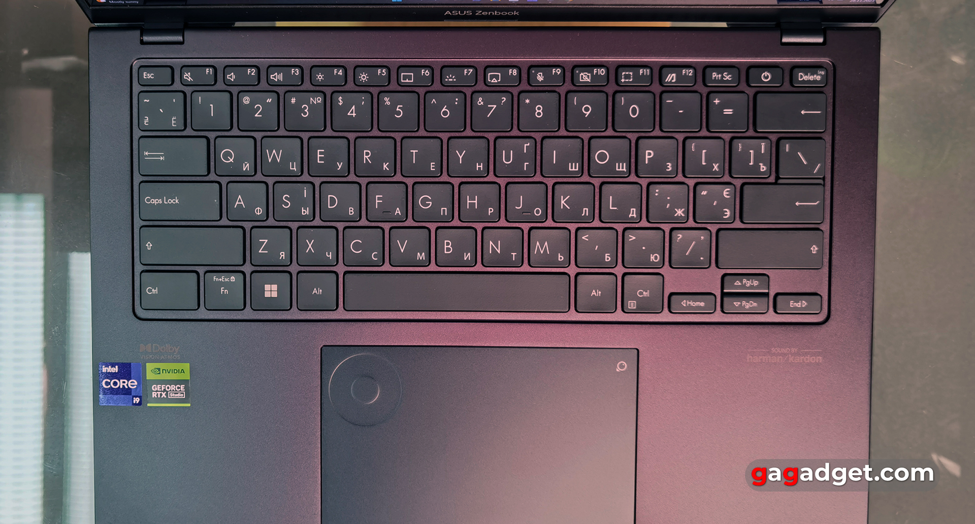 W lewym górnym rogu touchpada znajduje się dodatkowe sterowanie dotykowe ASUS DialPad. Jest to pierścień dotykowy, który jest lekko zagłębiony w touchpadzie. Można wchodzić w interakcje zarówno z pierścieniem, jak i okrągłym obszarem wewnątrz. Domyślnie DialPad odpowiada za regulację głośności głośników i jasności ekranu. Nie jest to pierwsza implementacja tego pomysłu w laptopach ASUS. Niektóre wielkoformatowe ProArt miały mechaniczny DialPad.