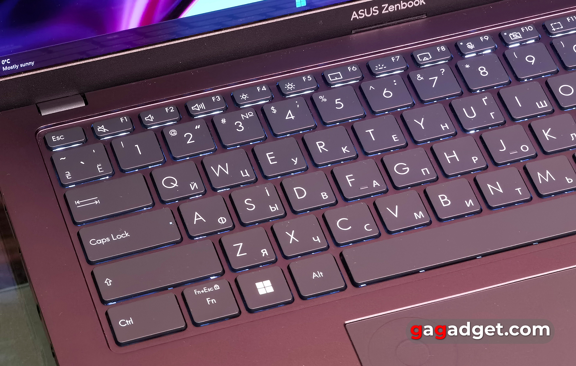 Klawiatura jest dość typowa dla ultrabooków ASUS. Ma standardowy układ bez dodatkowego bloku numerycznego. Górny rząd klawiszy funkcyjnych jest mniejszy. Górny rząd kończy się klawiszem Delete, przycisk zasilania znajduje się na lewo od niego. Blok strzałek ma również mniejszą wysokość, a Home, End, PgUp i PgDn są zduplikowane ze strzałkami do Fn. Zarówno Shift i Enter, jak i Backspace są długie, a klawisze są jednopoziomowe.