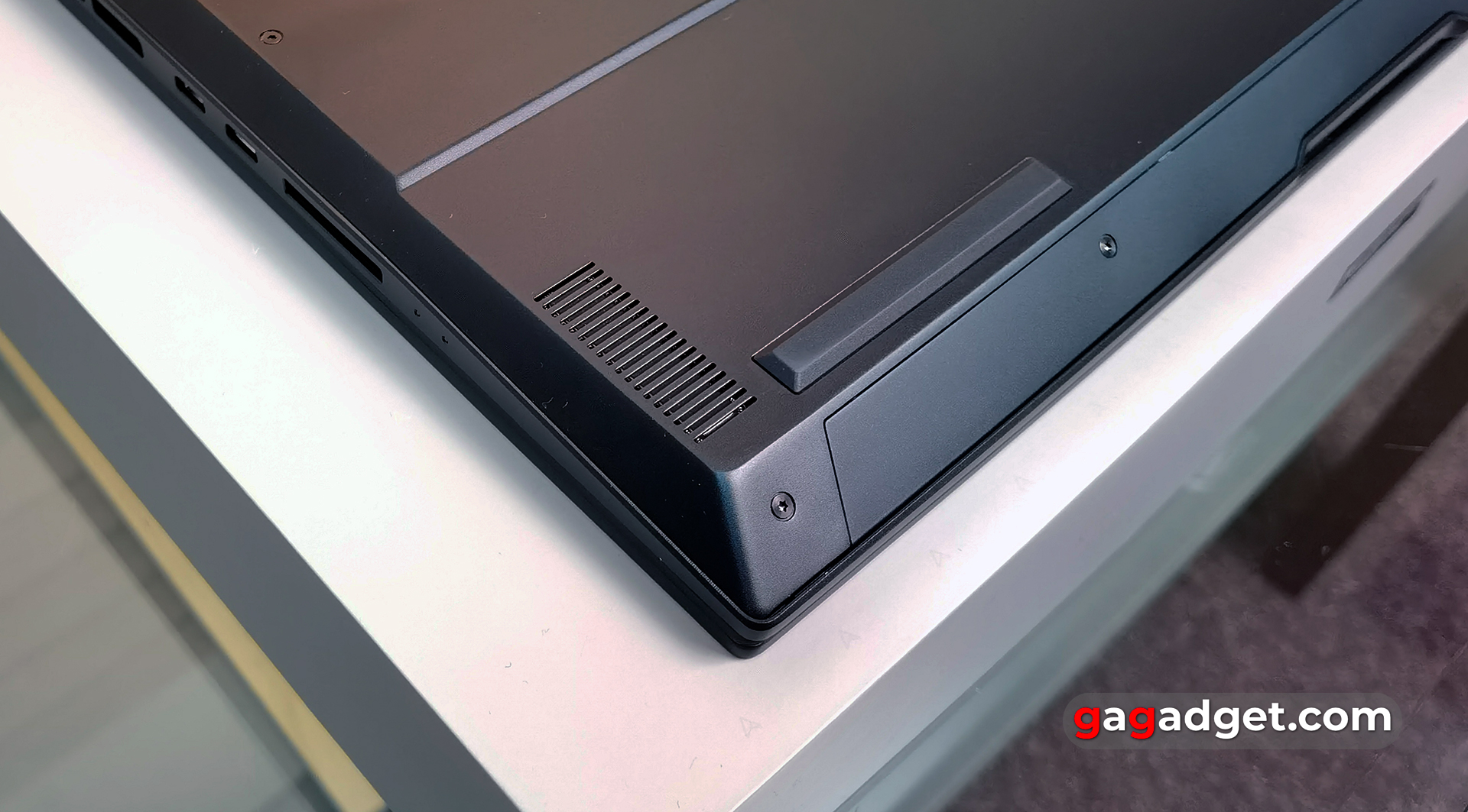 Spód jest standardowy: masywne gumowe nóżki, otwory wentylacyjne i głośniki stereo. Pokrywa jest przykręcona 10 śrubami. Pod nią użytkownik ma dostęp do dysku i pojedynczego gniazda pamięci RAM.