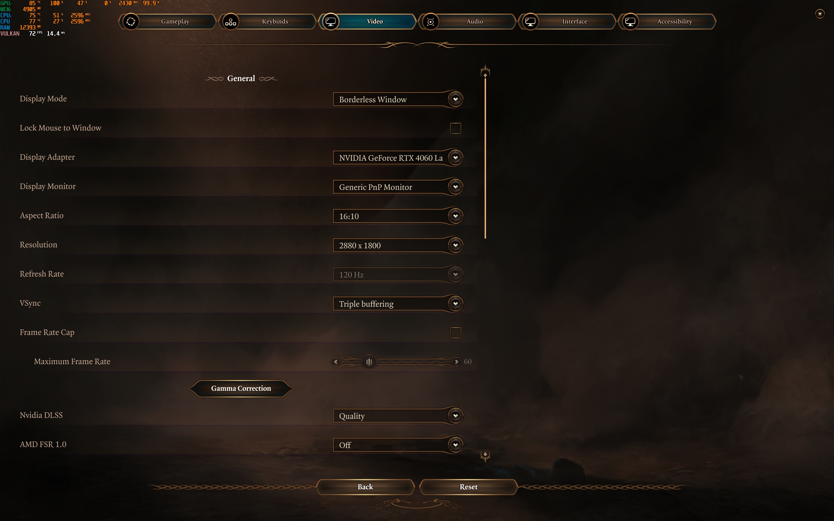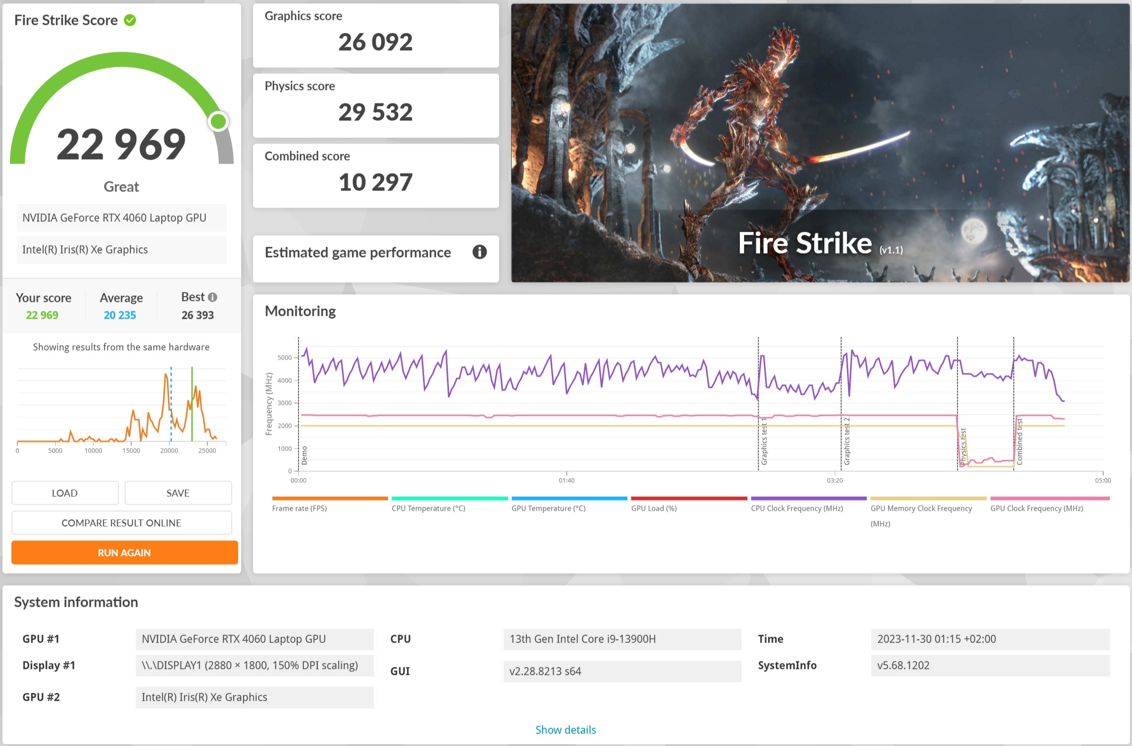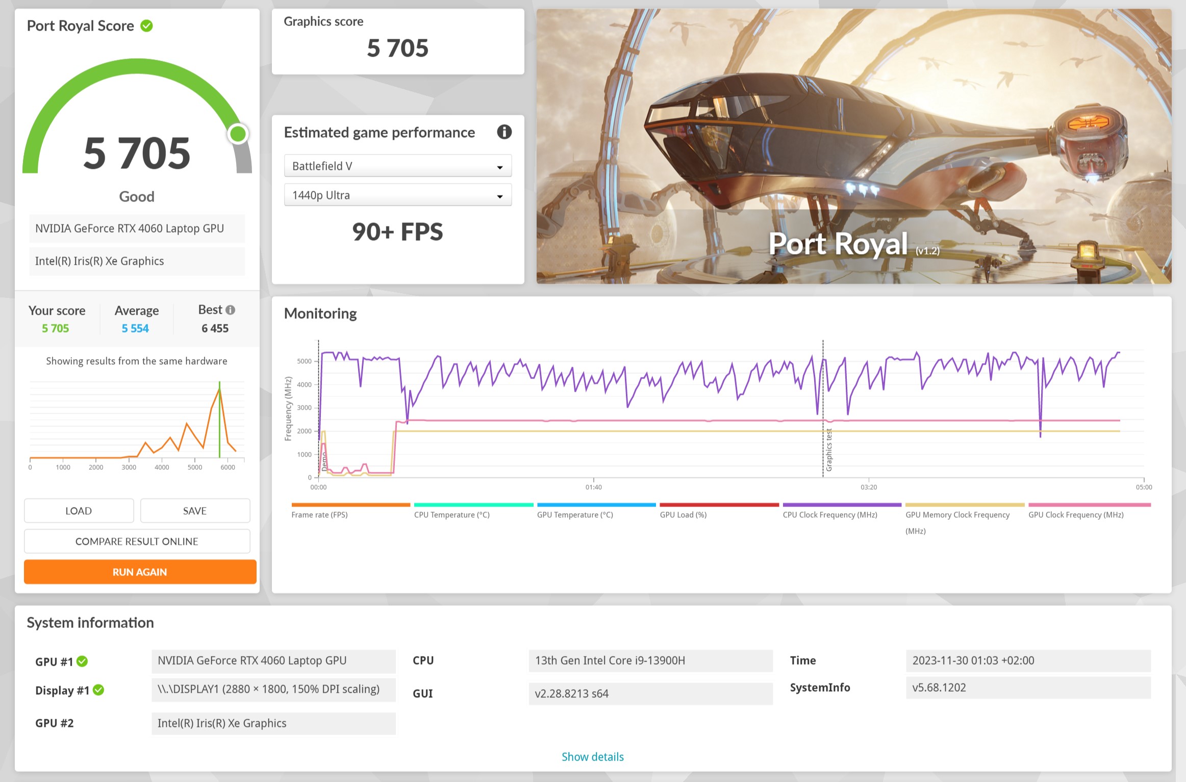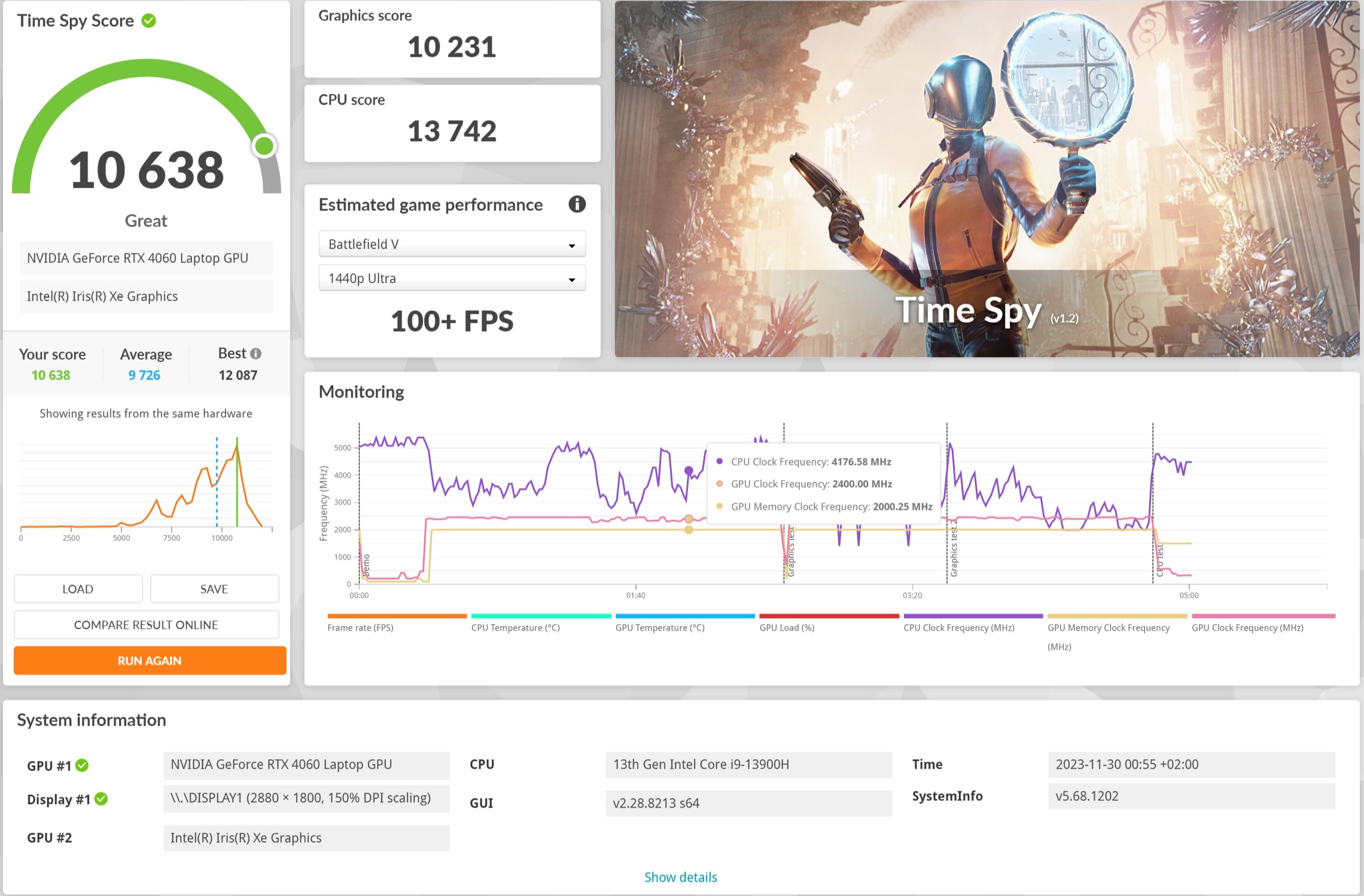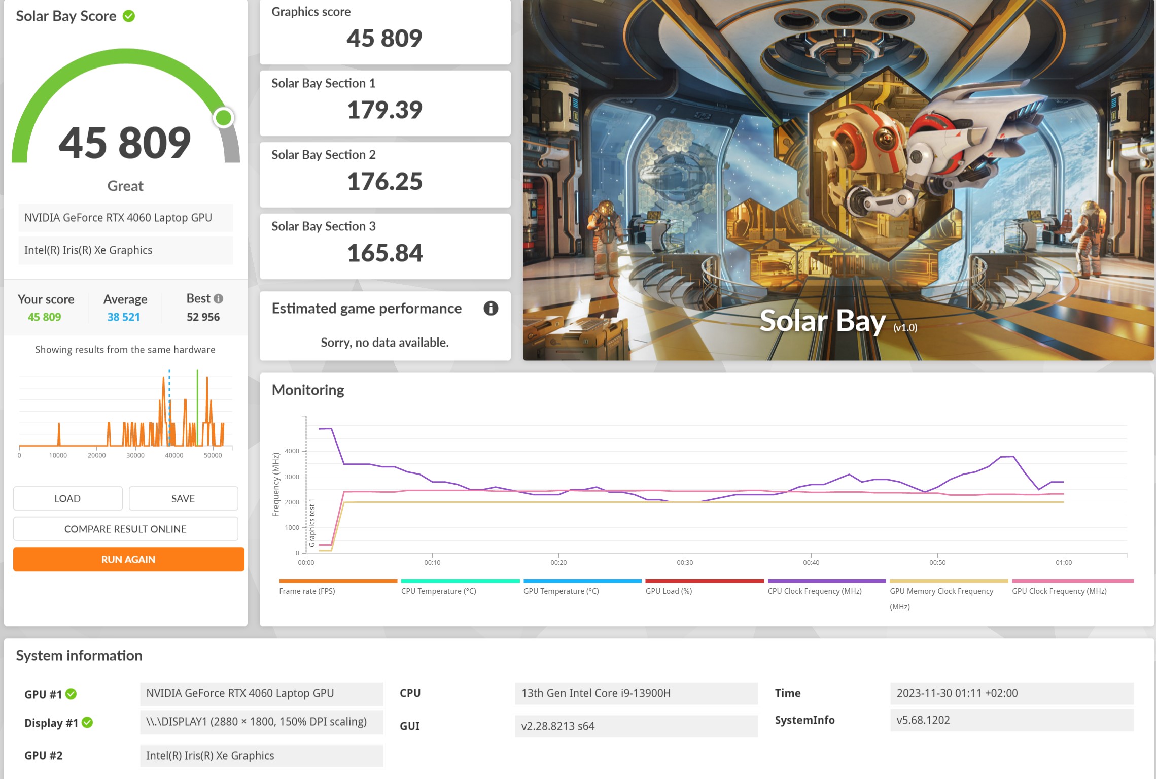 Pomimo pozycjonowania laptopa jako potężnego narzędzia pracy, wydajność jest wystarczająco dobra, aby grać w nowoczesne gry. Sensowne jest granie w rozdzielczości 1920x1200, a nie natywnej. Alan Wake 2 z wysokimi ustawieniami grafiki, niskimi ustawieniami ray tracingu, DLSS w trybie balansu i Frame Generation działa przy 50-60 FPS. Starfield na średnich ustawieniach, DLSS w trybie balansu i Frame Generation pokazuje 70-80 FPS w otwartych lokacjach i do 120 w zamkniętych. Baldur's Gate 3 w natywnej rozdzielczości, ustawieniach ultra z DLSS w trybie jakości to nieco ponad 70 FPS.