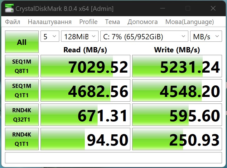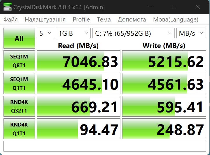 Dysk jest bardzo szybki. Prędkość odczytu sięga 7000 MB/s, a zapisu prawie 5300 MB/s: