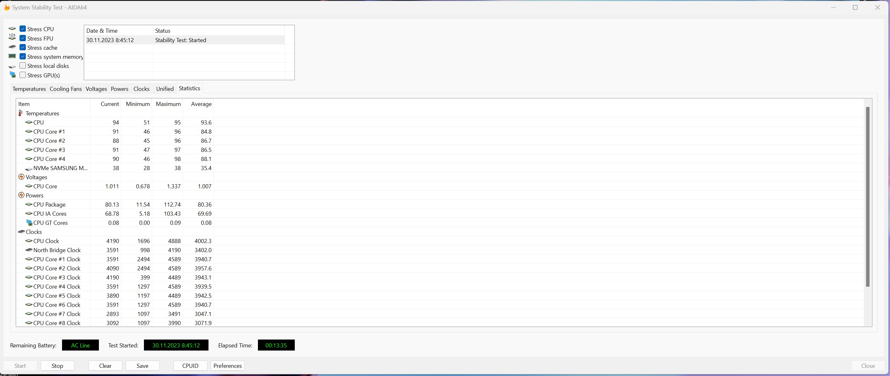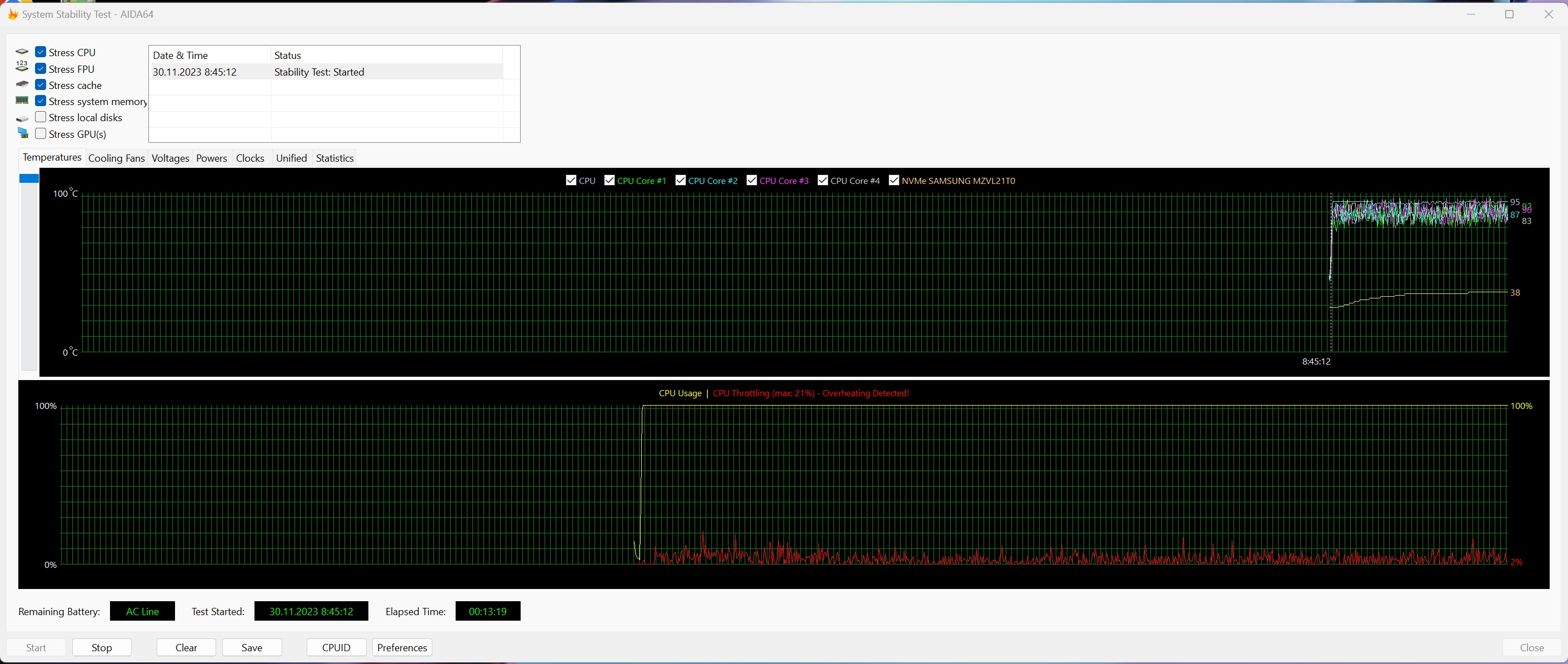 Tak potężne podzespoły niezwykle trudno schłodzić w kompaktowej, stosunkowo cienkiej obudowie. W ASUS Zenbook Pro 14 OLED (UX6404) za chłodzenie odpowiada 5 heatpipe'ów, 4 radiatory i 2 wentylatory. Przy długotrwałym maksymalnym obciążeniu podzespoły mogą nagrzewać się do 95°, występuje throttling z wartością szczytową do 21%, ale zazwyczaj wartości te wahają się od kilku do 10%. Jednocześnie średnia częstotliwość procesora wynosi 4 GHz, co jest bardzo dobrym wynikiem. Przy maksymalnych obrotach układ chłodzenia hałasuje dość mocno. Obudowa nagrzewa się, ale klawiatura pozostaje zimna, więc praca jest komfortowa.