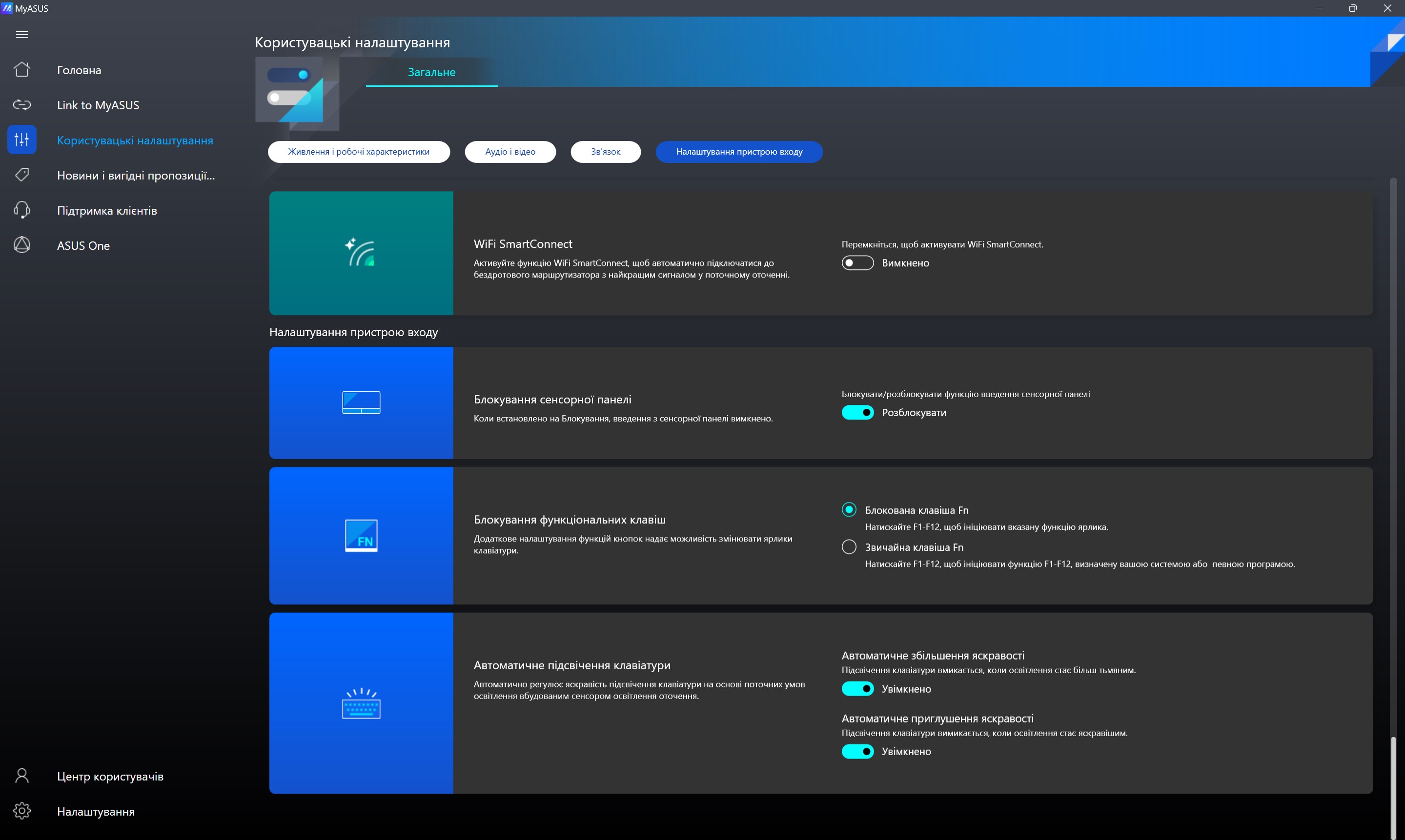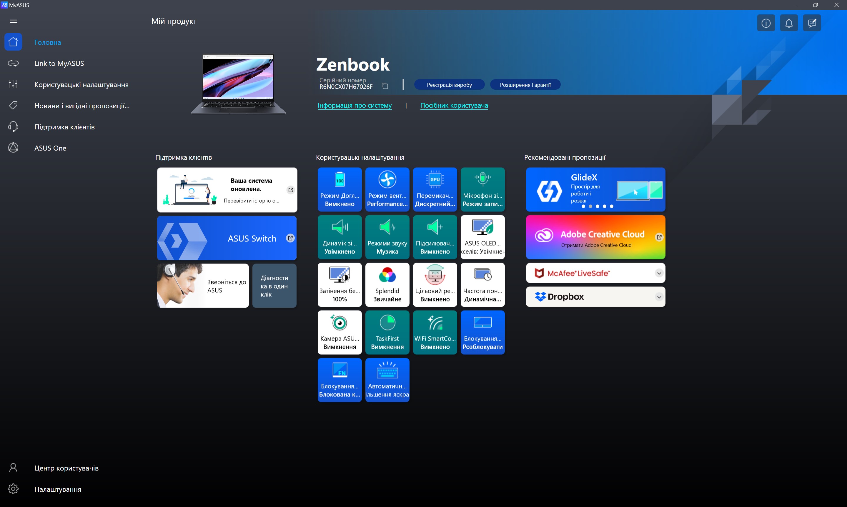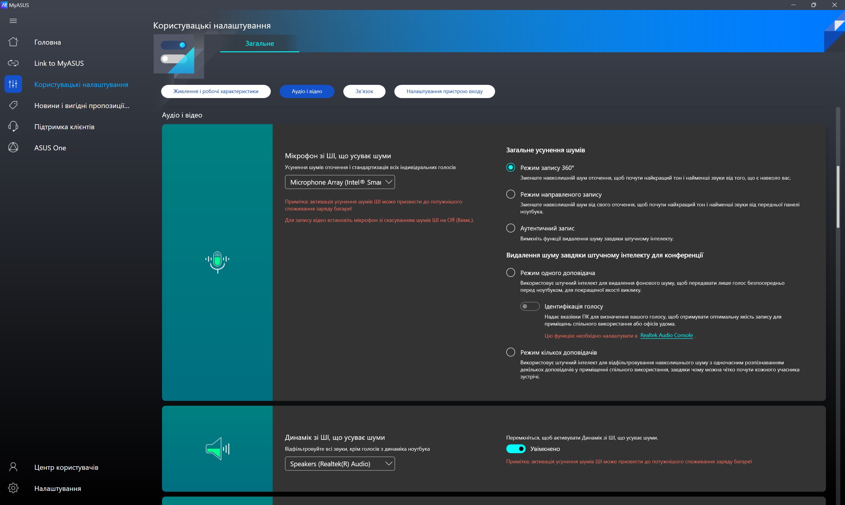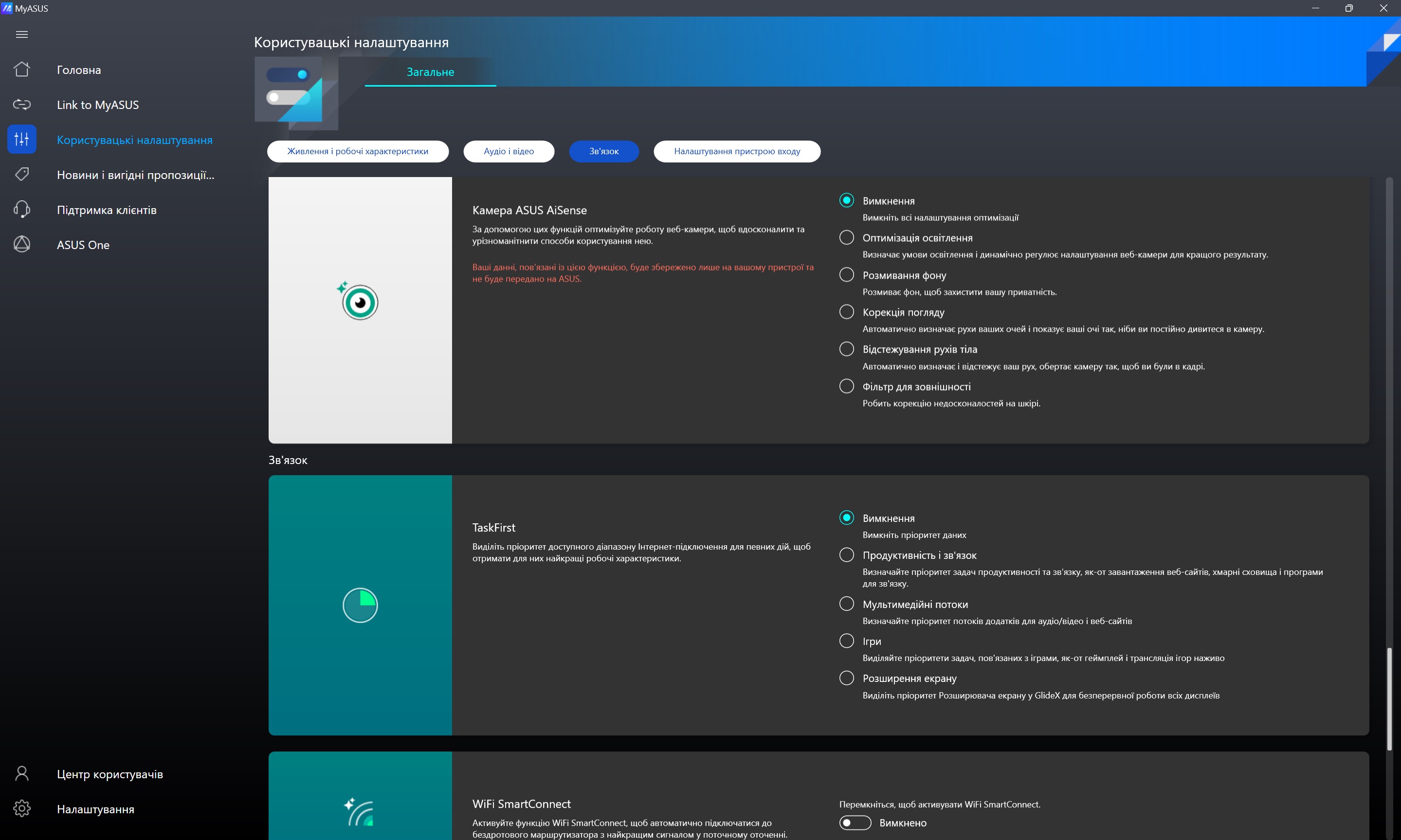 Laptop ma zainstalowanych kilka zastrzeżonych aplikacji. MyASUS jest główną z nich, która jest używana we wszystkich laptopach firmy. Odpowiada ona za zdecydowaną większość ustawień. Aktualizacje, tryby pracy, redukcja szumów, głośniki itp: