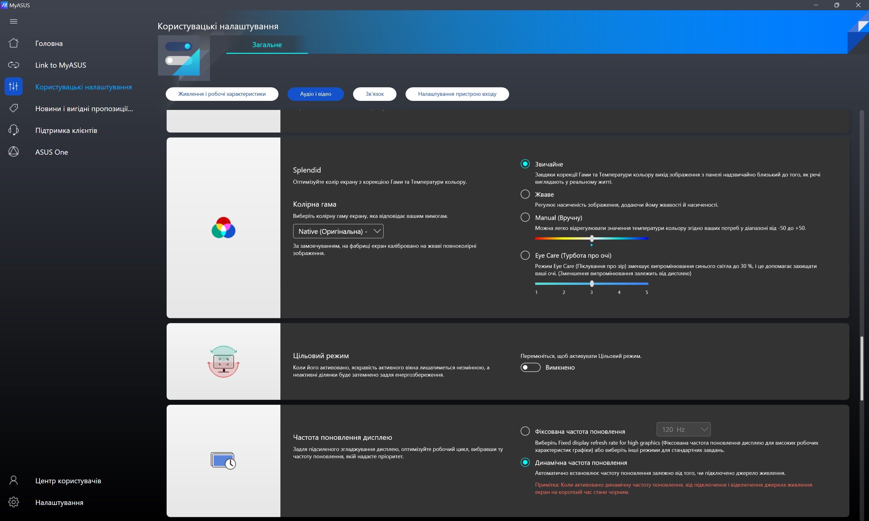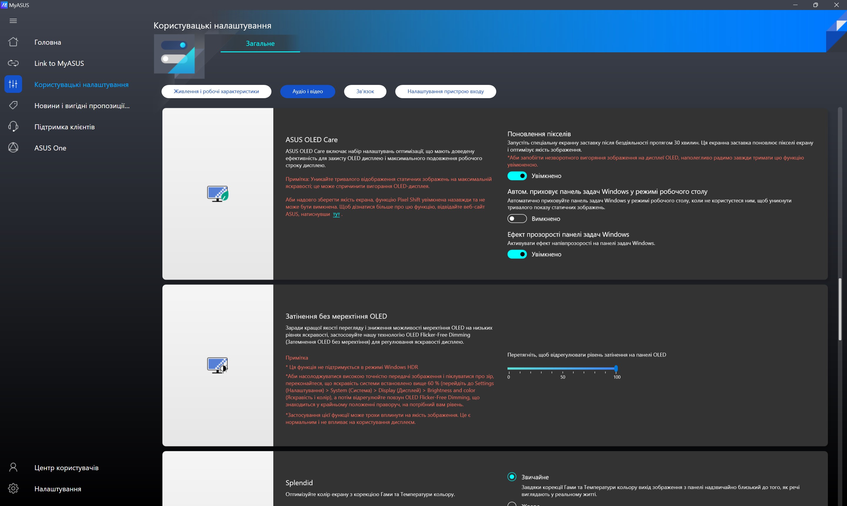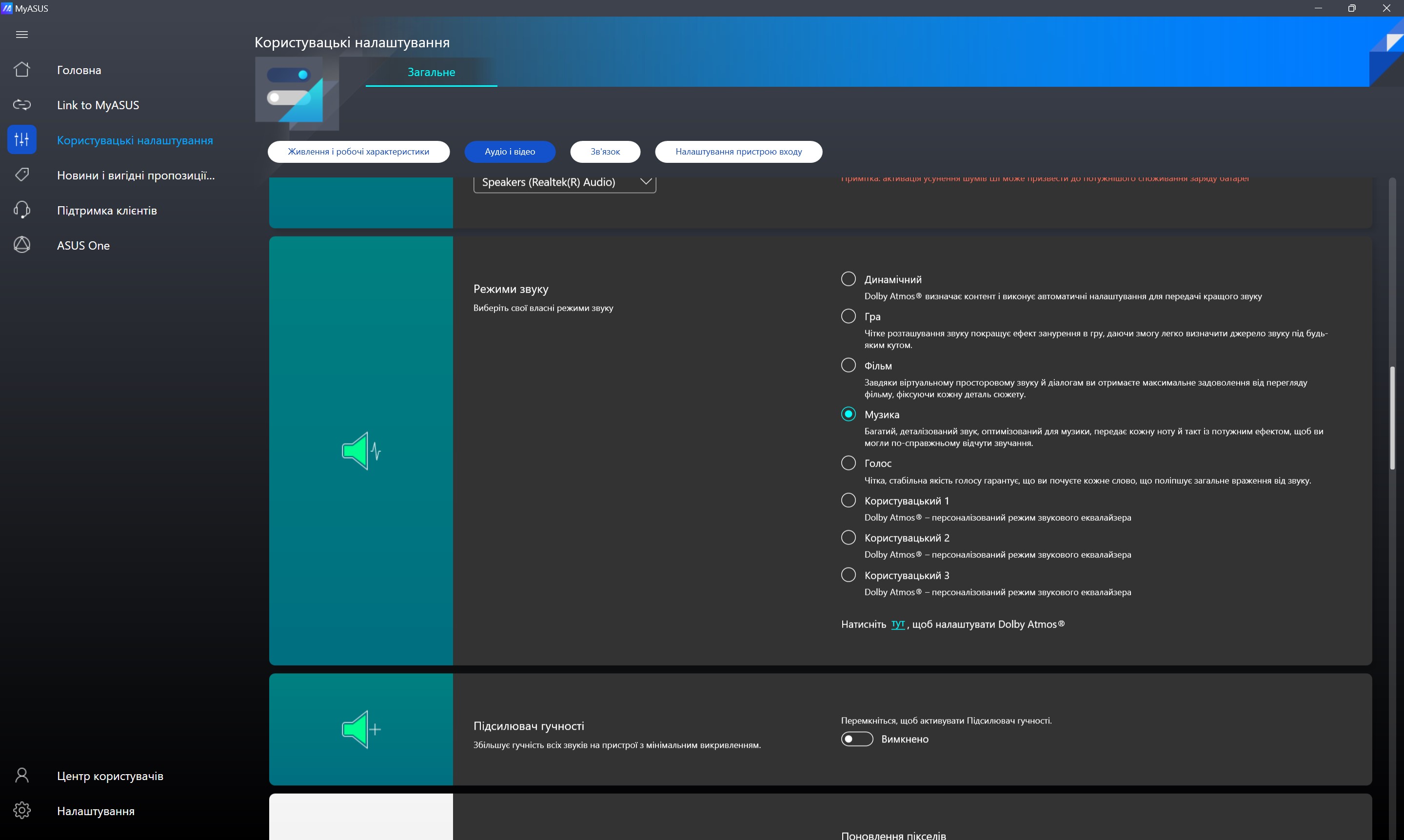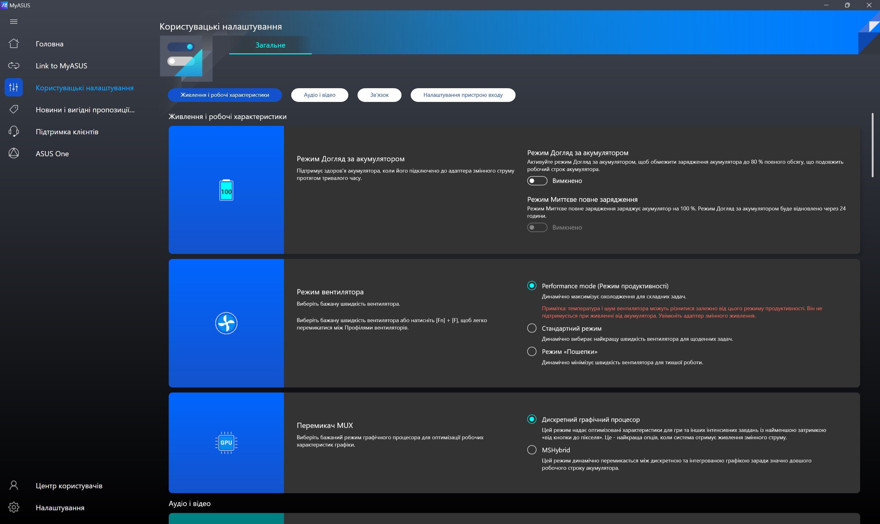 Laptop ma zainstalowanych kilka zastrzeżonych aplikacji. MyASUS jest główną z nich, która jest używana we wszystkich laptopach firmy. Odpowiada ona za zdecydowaną większość ustawień. Aktualizacje, tryby pracy, redukcja szumów, głośniki itp: