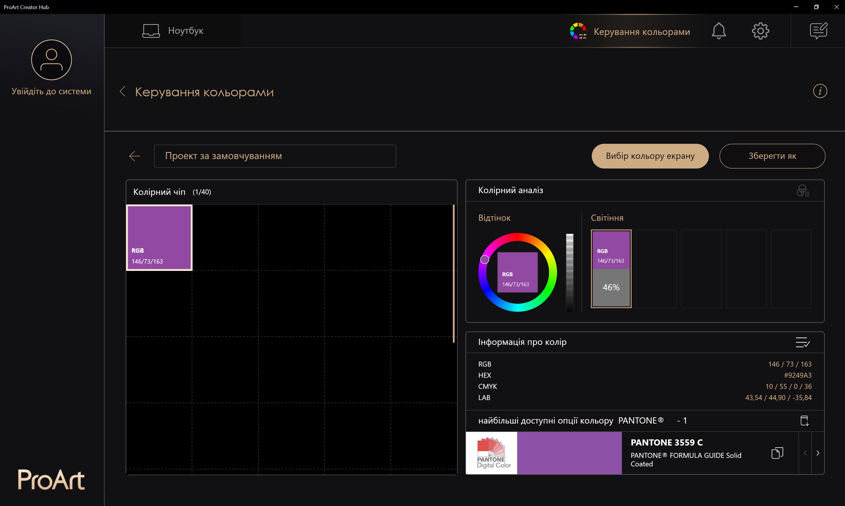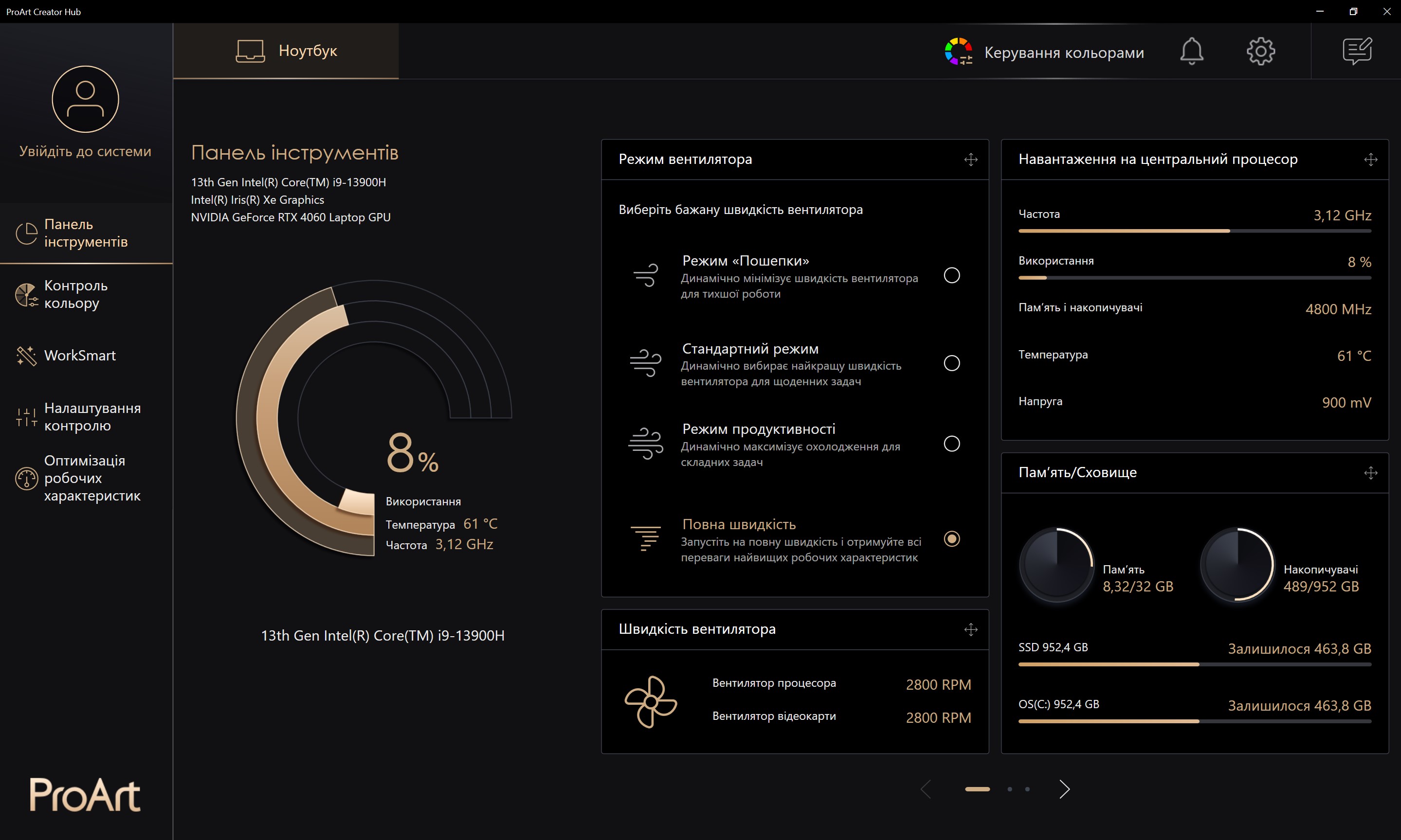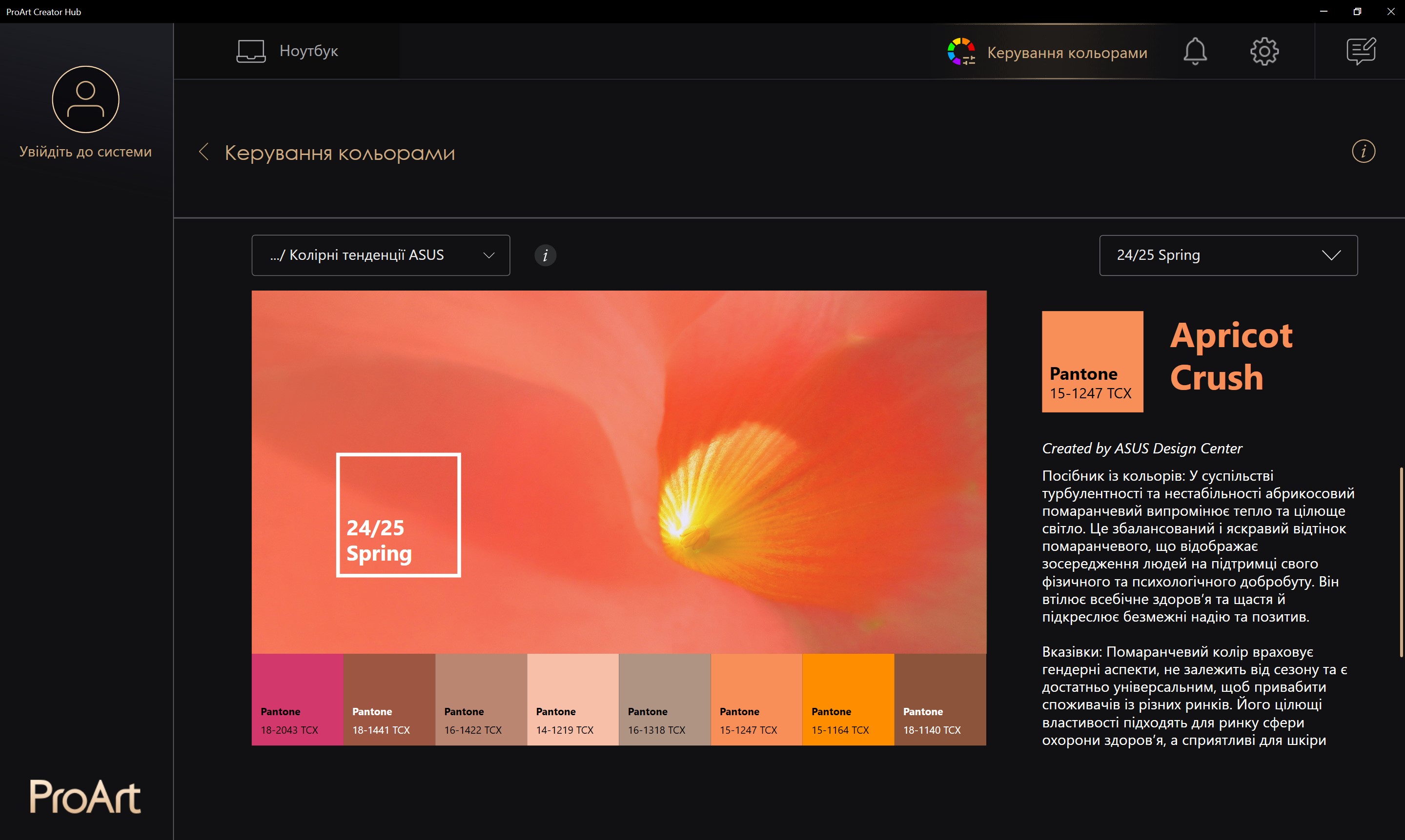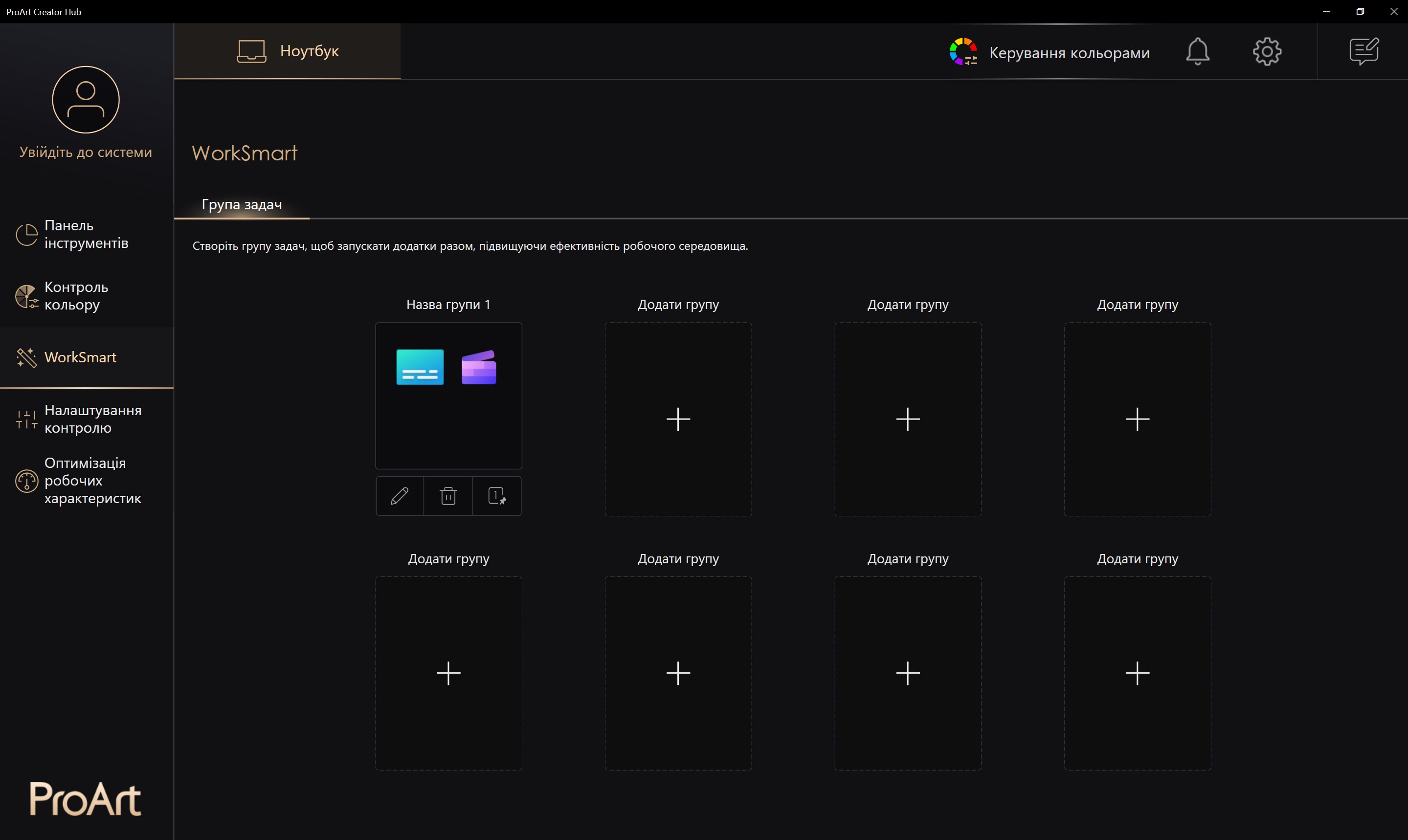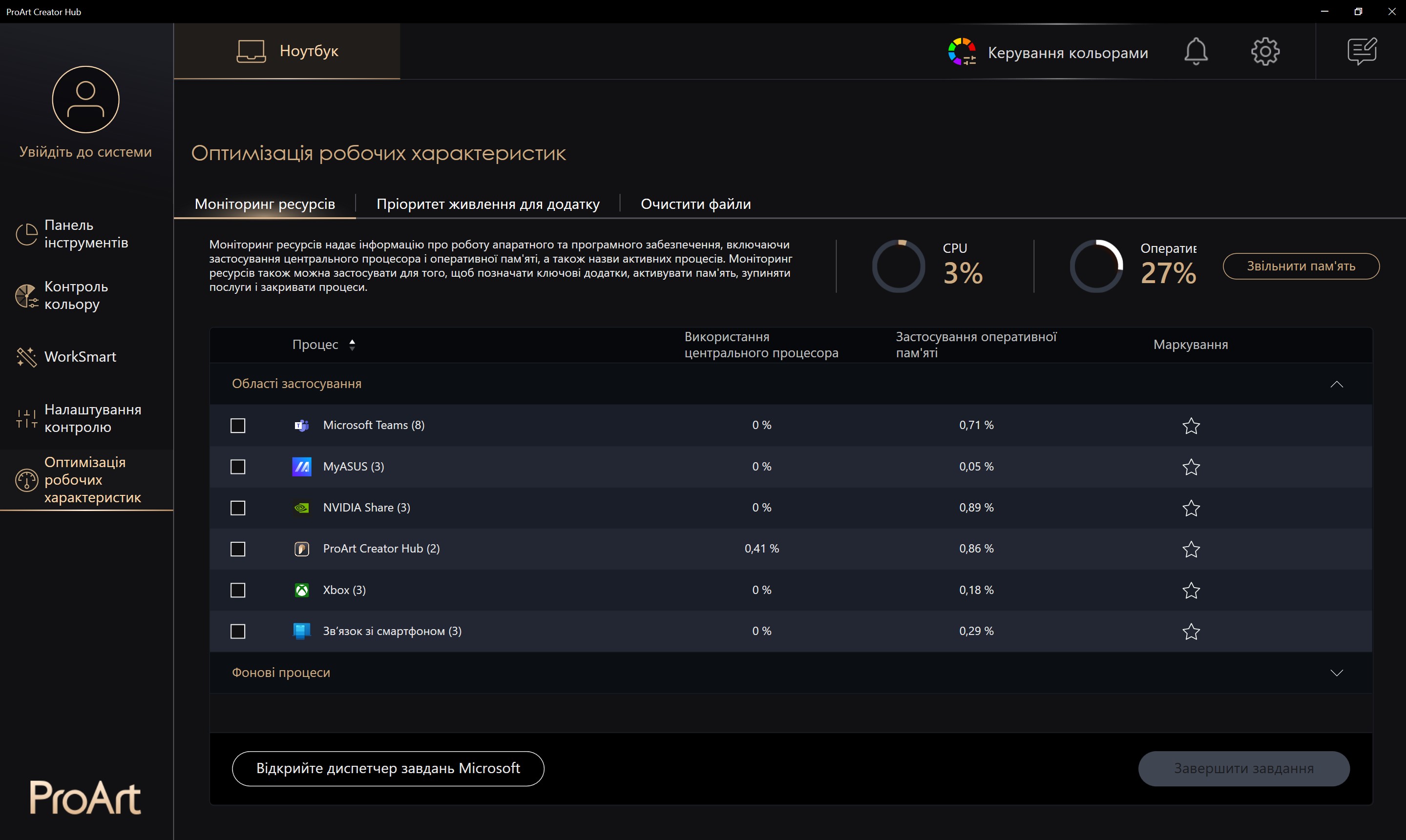 ProArt Creator Hub posiada również monitorowanie obciążenia, tryby pracy układu chłodzenia oraz aktualizacje. Dostępny jest również tryb kalibracji ekranu (wymaga kalibratora X-Rite i1 Display Pro), ustawienia DialPad, WorkSmart (konfigurowanie grup aplikacji do szybkiego uruchamiania) i zarządzanie kolorami (rodzaj przewodnika po kolorach wykorzystującego dane Pantone).