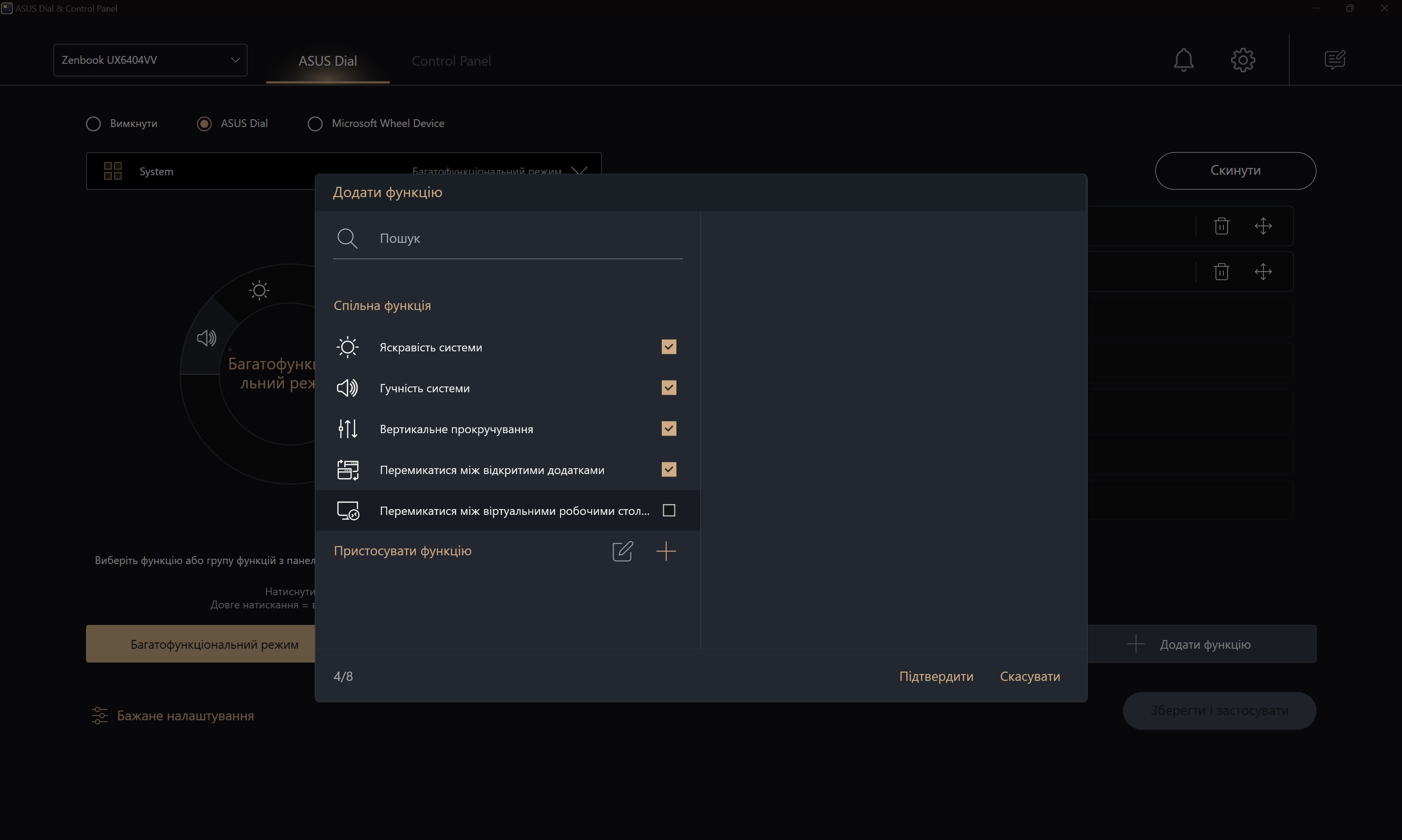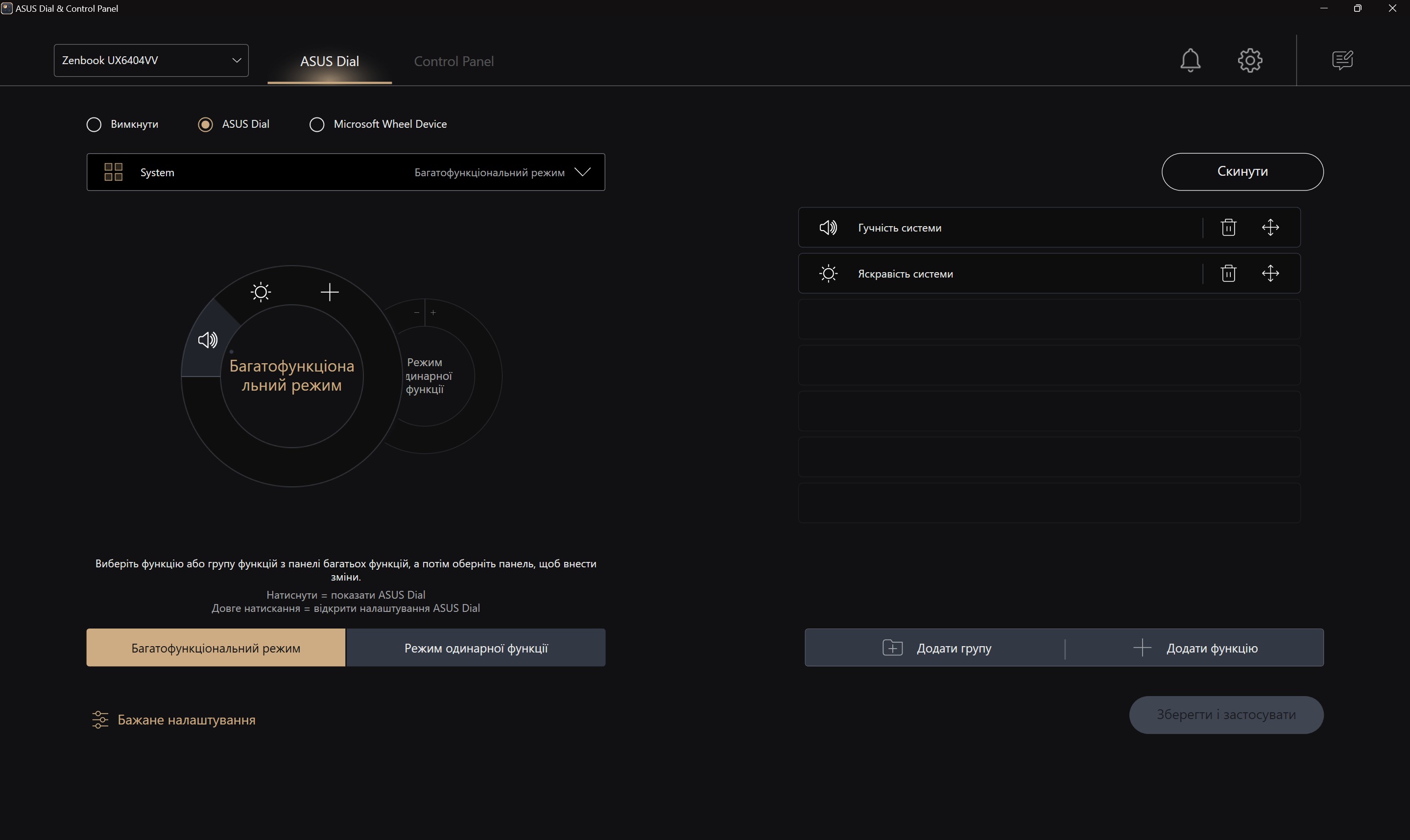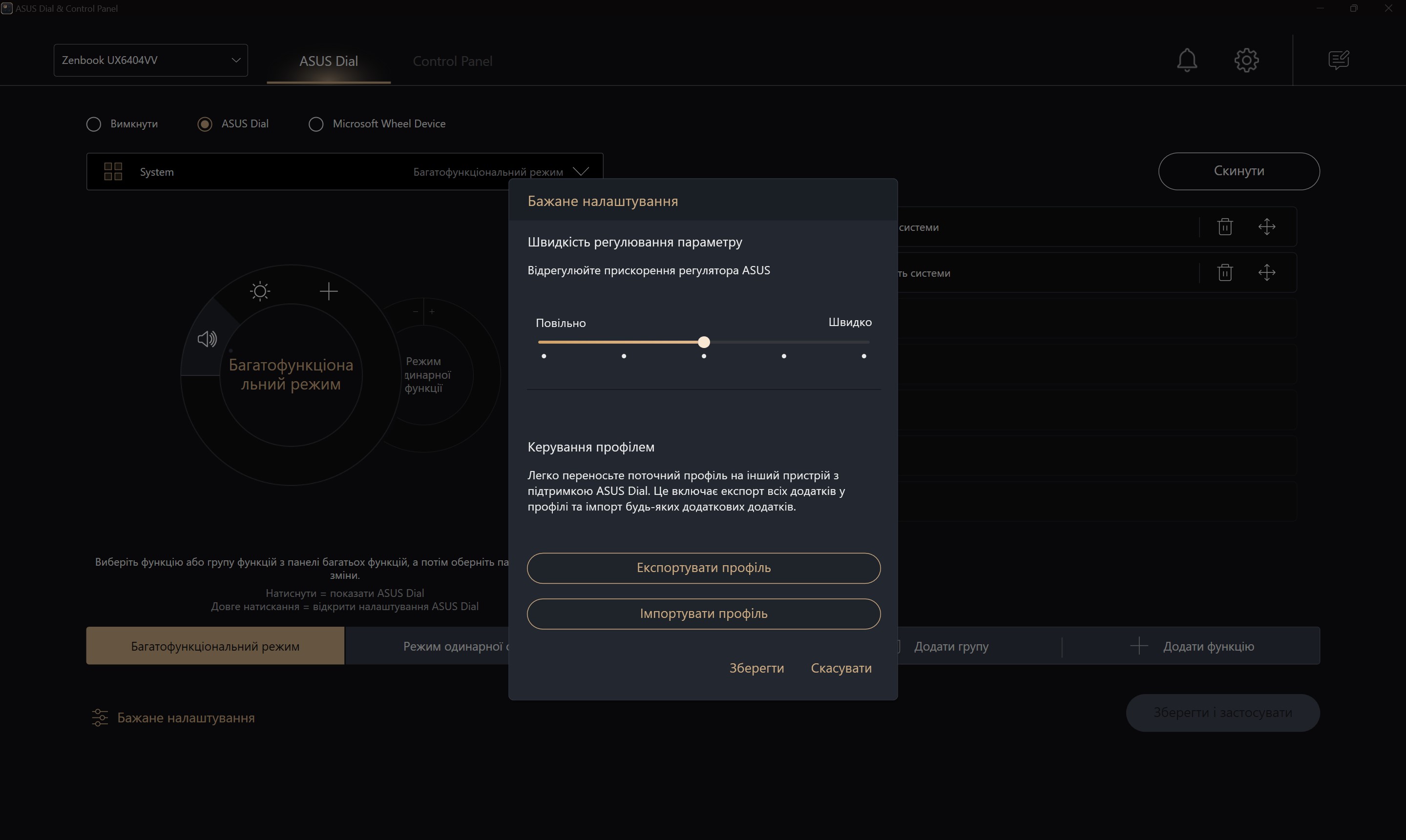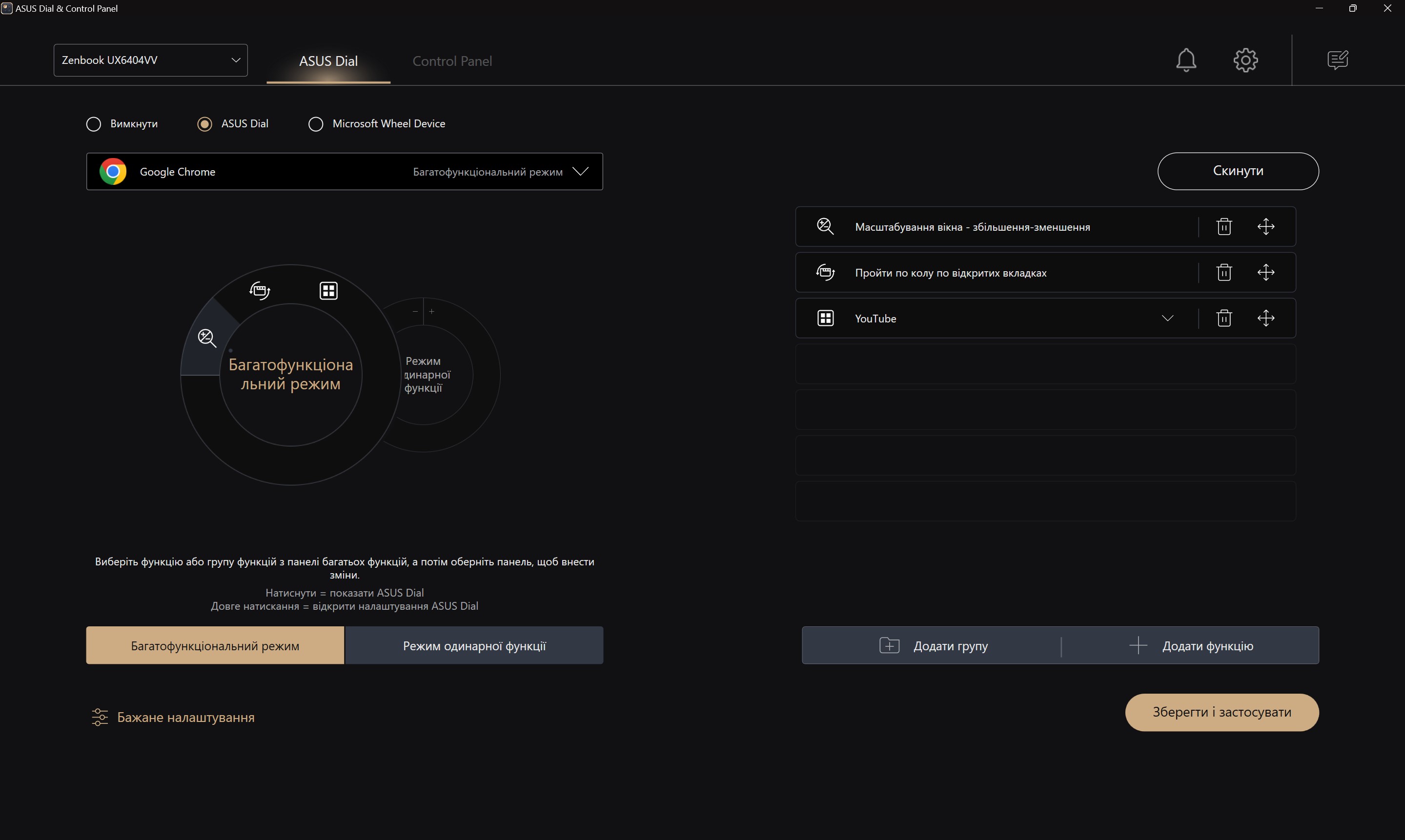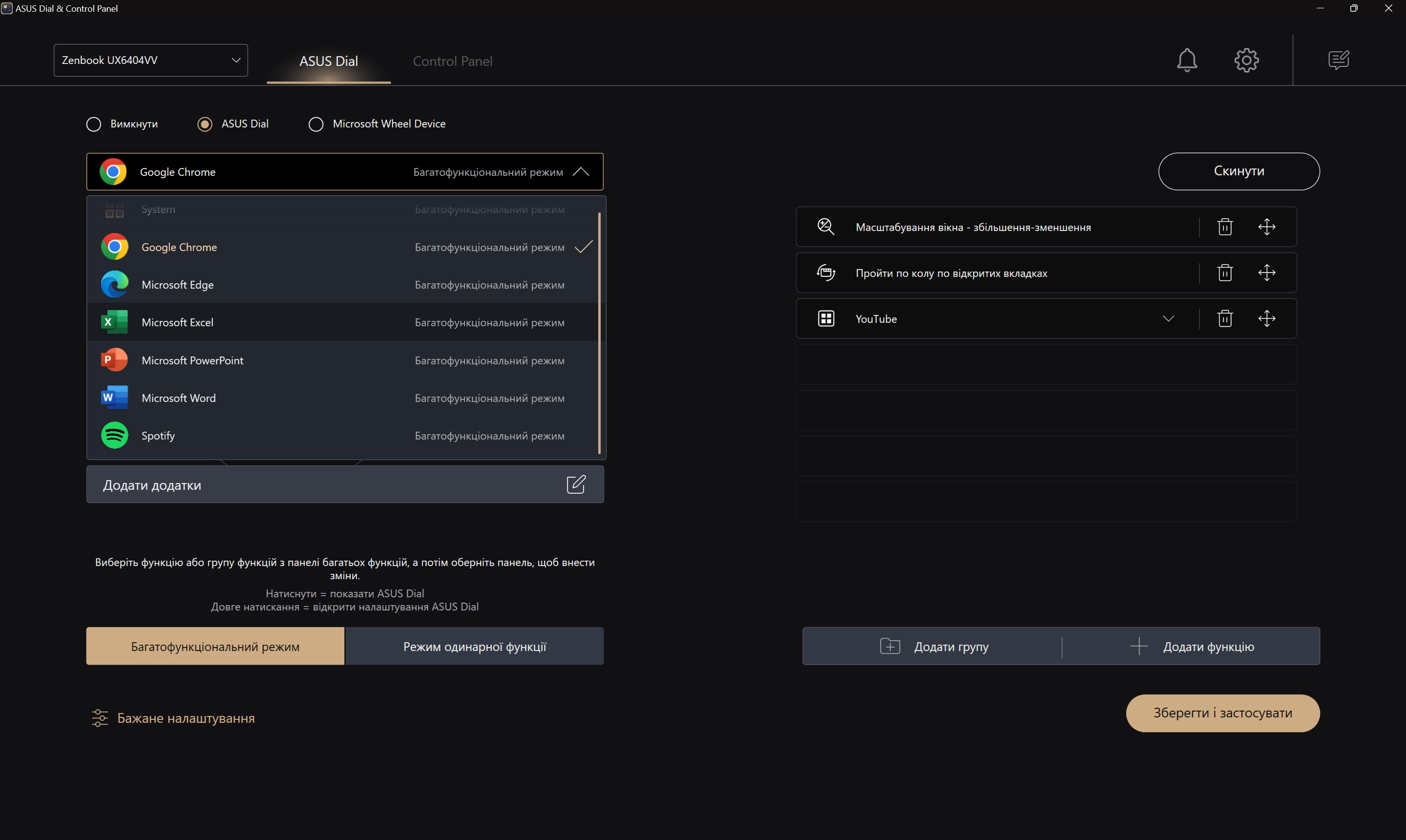 Własna aplikacja ProArt Creator Hub pozwala znacznie rozszerzyć funkcjonalność DialPada i powiązać określone funkcje z dowolną aplikacją. Na przykład przewijanie w przeglądarce, przewijanie na YouTube itp. Warto wspomnieć, że istnieją gotowe ustawienia wstępne dla zestawu głównych edytorów Adobe: Photoshop, Illustrator, After Effects, Premiere Pro, Lightroom. Istnieje również wsparcie dla urządzenia Microsoft Surface Dial, które może współpracować z DialPadem.