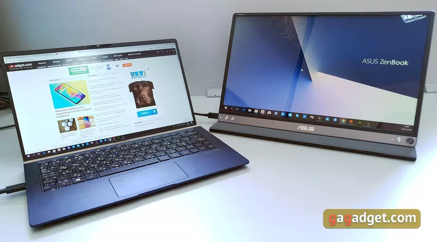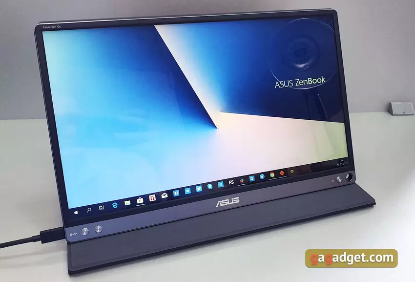 Smartfon można podłączyć za pomocą dostarczonego kabla typu C. Producent zaleca instalację aplikacji DisplayLink, chociaż nowoczesne smartfony „kontaktują” z monitorem i bez niego. Obsługiwane są również modele z obsługą trybu pulpitu (Samsung Galaxy S10e natychmiast przełączył się na tryb Dex). Ale dla komfortowej pracy nadal warto podłączyć klawiaturę i mysz Bluetooth: ekran nie jest wrażliwy na dotyk: