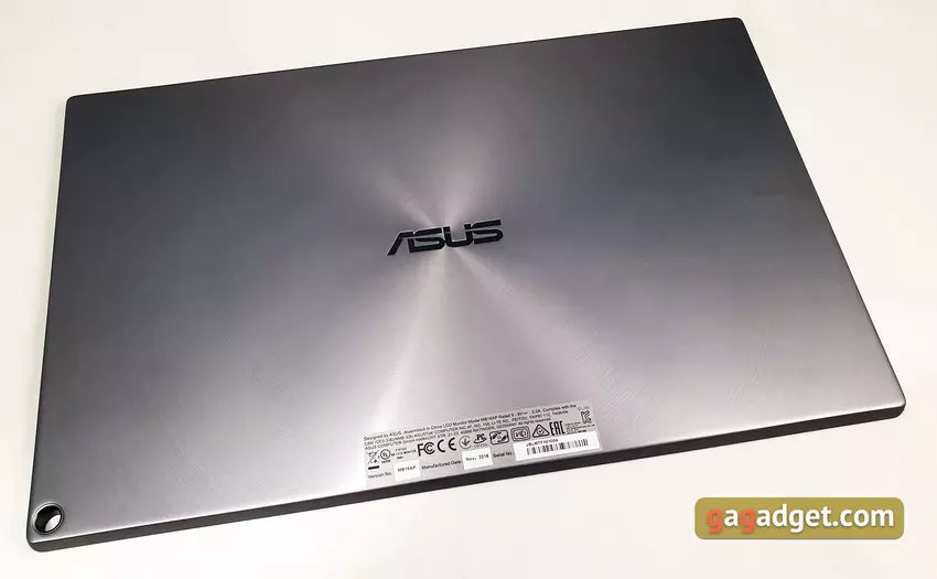 Sam monitor jest wykonany w najlepszych tradycjach laptopów ZenBook: metalowa obudowa z koncentrycznym szlifowaniem marki i logo ASUS na środku. Korpus jest mały: 359,7 x 226,4, a grubość to tylko 8 mm. Monitor waży 800 g, więc bardzo dobrze jest go transportować. Obrzeże krawędzi ekranu wykonane jest z matowego czarnego plastiku, a na dole znajduje się srebrny pasek z przyciskami sterującymi i logo ASUS:
