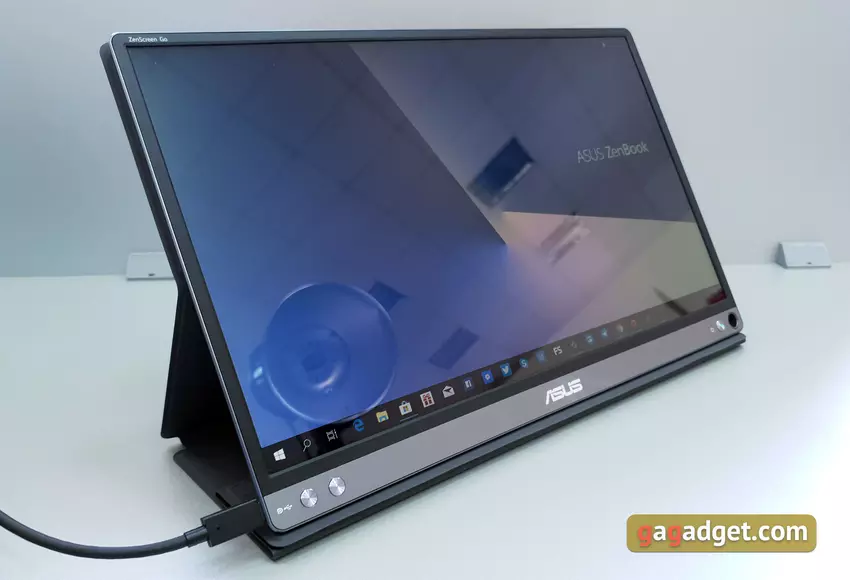 Po podłączeniu do komputera / laptopa możesz wybrać, z czego monitor będzie zasilany: zewnętrzne źródło lub bateria wewnętrzna. Aby to kontrolować, istnieje menu ekranowe, które jest kontrolowane przez dwa przyciski sprzętowe po prawej stronie. Nie oznacza to, że ta opcja jest szczególnie wygodna i oczywista.