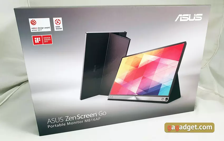 Monitor jest dostarczany w dużym pudełku z czarnego kartonu z pięknym nadrukiem. Wewnątrz - sam monitor, zasilacz, kabel Type-C, adapter od Type-C do Type-A, składany stojak, uchwyt i dokumentacja.
