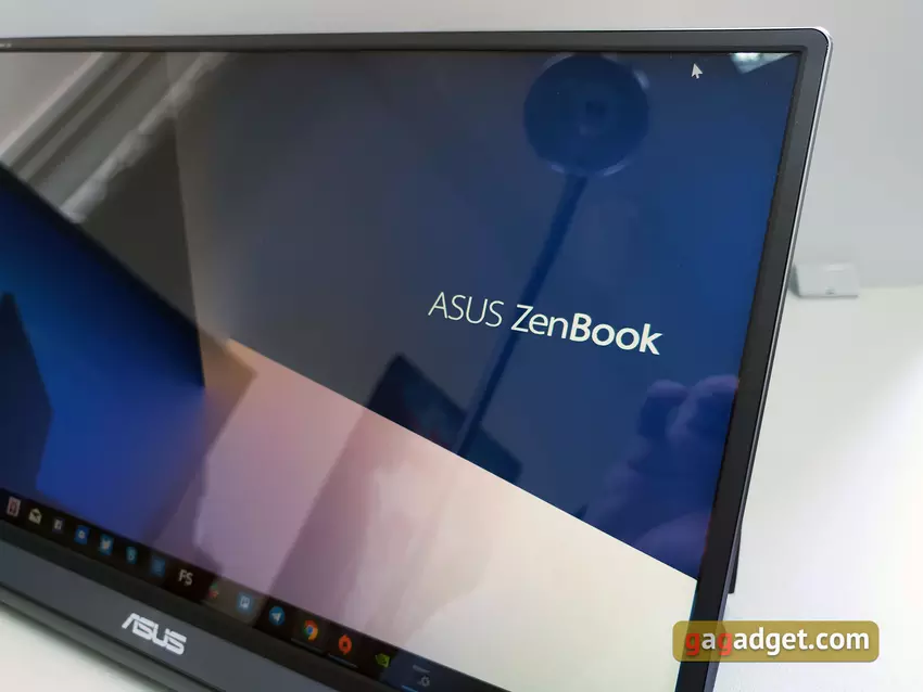 Monitor korzysta z matrycy IPS o rozdzielczości 1920x1080, obiecując raczej skromną maksymalną jasność 220 cd / m2 i statyczny współczynnik kontrastu 800: 1. Ekran nie jest dotykowy, ale powłoka jest błyszcząca. Aby zmniejszyć zmęczenie oczu, ASUS użył technologii bez migotania i niebieskiego filtra z pięcioma poziomami na monitorze.Kąty widzenia są maksymalne, a obraz jest przyjemny, ale jasność jest wystarczająca tylko do pracy przy niskim poziomie światła otoczenia. W domu jest całkiem wygodnie, ale w jasnych lampach nie wystarczy. Istnieją różne tryby wyświetlania, w tym konfigurowalne „Standard”, „Fiction”, „Theater” i sRGB. W tym drugim nie można regulować jasności.