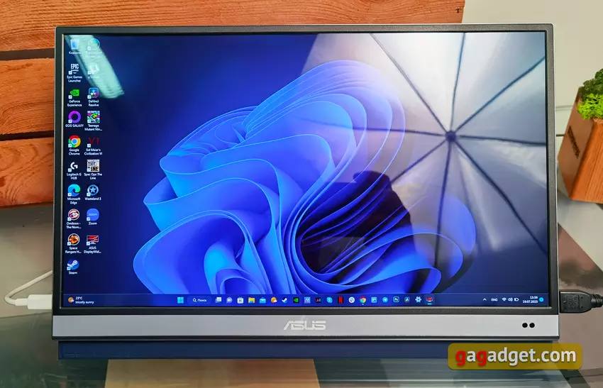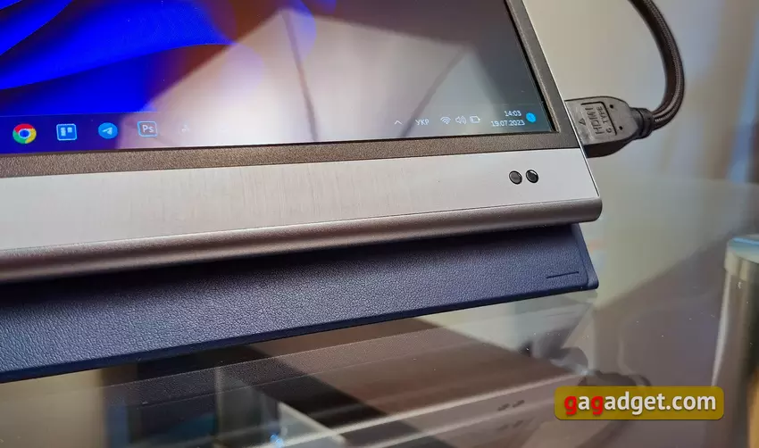 Większość monitora ma bardzo małą grubość, zaledwie 5 mm. Jest to całkiem porównywalne do standardowej pokrywy laptopa. Pogrubienie znajduje się w dolnej części, gdzie znajduje się cała elektronika i złącza. Po prawej stronie znajdują się MiniHDMI, gniazdo audio 3,5 mm i USB Type-C (Display Port). Może on służyć zarówno do przesyłania sygnału, jak i zasilania: